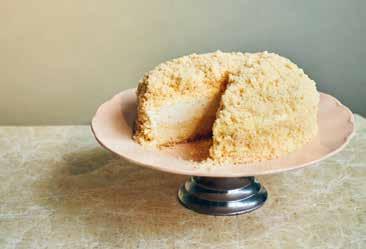 To finish, whip the cream and sugar together until very soft peaks form – the cream should still be pourable. Remove the cheesecake from the tin, then place it on a cake stand or up-turned bowl so the sides are fully accessible. Spread the whipped cream in a very thin layer all over the surface of the cake, then use your hands to gently press the rest of the cake crumb into the cream, fully coating the cake. Keep in the refrigerator until ready to serve.