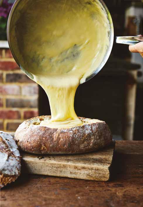 Layer half the cheeses into the bread and top with crème fraîche. Sprinkle over the rest of the cheeses and put the bread onto a baking tray. Pop into the oven for 15–20 minutes.