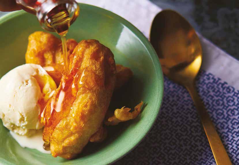 Sift the self-raising flour into a large bowl, add the bicarbonate of soda and the water and mix to form a smooth batter. Lightly dust the bananas in plain flour, then dip into the batter to coat and carefully drop into the oil.