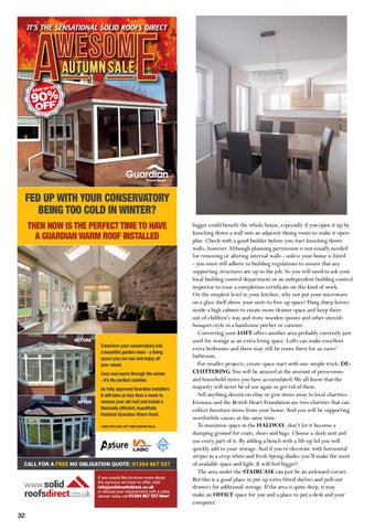 bigger could benefit the whole house, especially if you open it up by knocking down a wall into an adjacent dining room to make it openplan. Check with a good builder before you start knocking down walls, however. Although planning permission is not usually needed for removing or altering internal walls - unless your home is listed - you must still adhere to building regulations to ensure that any supporting structures are up to the job. So you will need to ask your local building control department or an independent building control inspector to issue a completion certificate on this kind of work. On the simplest level in your kitchen, why not put your microwave on a glass shelf above your units to free up space? Hang sharp knives inside a high cabinet to create more drawer space and keep them out of children’s way and store wooden spoons and other utensils bouquet-style in a handsome pitcher or canister. Converting your LOFT offers another area probably currently just used for storage as an extra living space. Lofts can make excellent extra bedrooms and there may still be room there for an eaves’ bathroom. For smaller projects, create space start with one simple trick: DECLUTTERING.You will be amazed at the amount of possessions and household items you have accumulated. We all know that the majority will never be of use again so get rid of them. Sell anything decent on ebay or give items away to local charities. Emmaus and the British Heart Foundation are two charities that can collect furniture items from your home. And you will be supporting worthwhile causes at the same time. To maximise space in the HALLWAY, don’t let it become a dumping ground for coats, shoes and bags. Choose a sleek unit and use every part of it. By adding a bench with a lift-up lid you will quickly add to your storage. And if you re-decorate with horizontal stripes in a crisp white and fresh Spring shades you’ll make the most of available space and light. It will feel bigger! The area under the STAIRCASE can just be an awkward corner. But this is a good place to put up extra fitted shelves and pull-out drawers for additional storage. If the area is quite deep, it may make an OFFICE space for you and a place to put a desk and your computer.