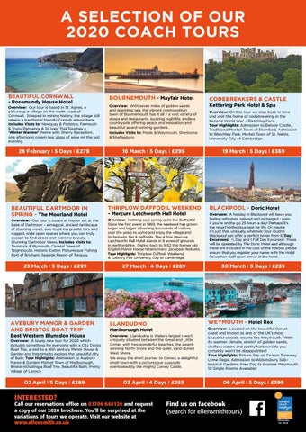 Call our reservations office on 01706 648126 and request a copy of our 2020 brochure. You’ll be surprised at the variations of tours we operate. Visit our website at www.ellensmith.co.uk