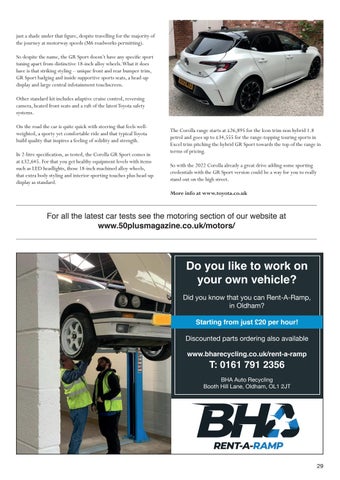 MOTORING | 50 PLUS MAGAZINE For SCRAP vehicle prices, call us, or visit www.bharecycling.co.uk/scrap-my-car-oldham/T:01617912356 BHA Auto Recycling Booth Hill Lane, Oldham, OL1 2JT Broken car or van? Failed MOT? No problem! We WANT to buy your vehicle! Scrap your vehicle with us and we will give your next car a FREE health check PLUS... 20% off ALL our services! 28