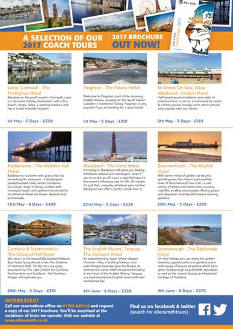 Call our reservations office on 01706 648126 and request a copy of our 2017 brochure. You’ll be surprised at the variations of tours we operate. Visit our website at www.ellensmith.co.uk