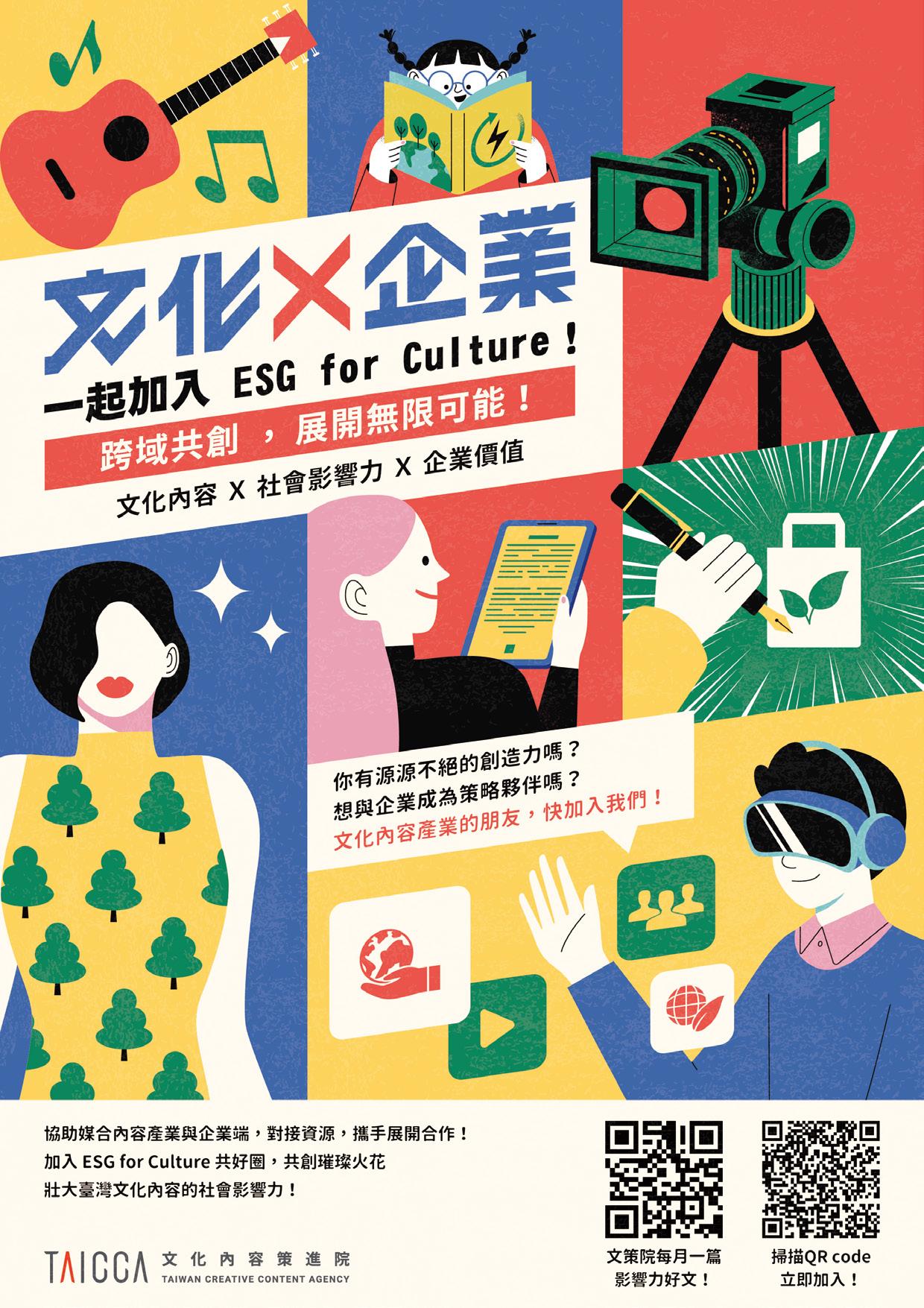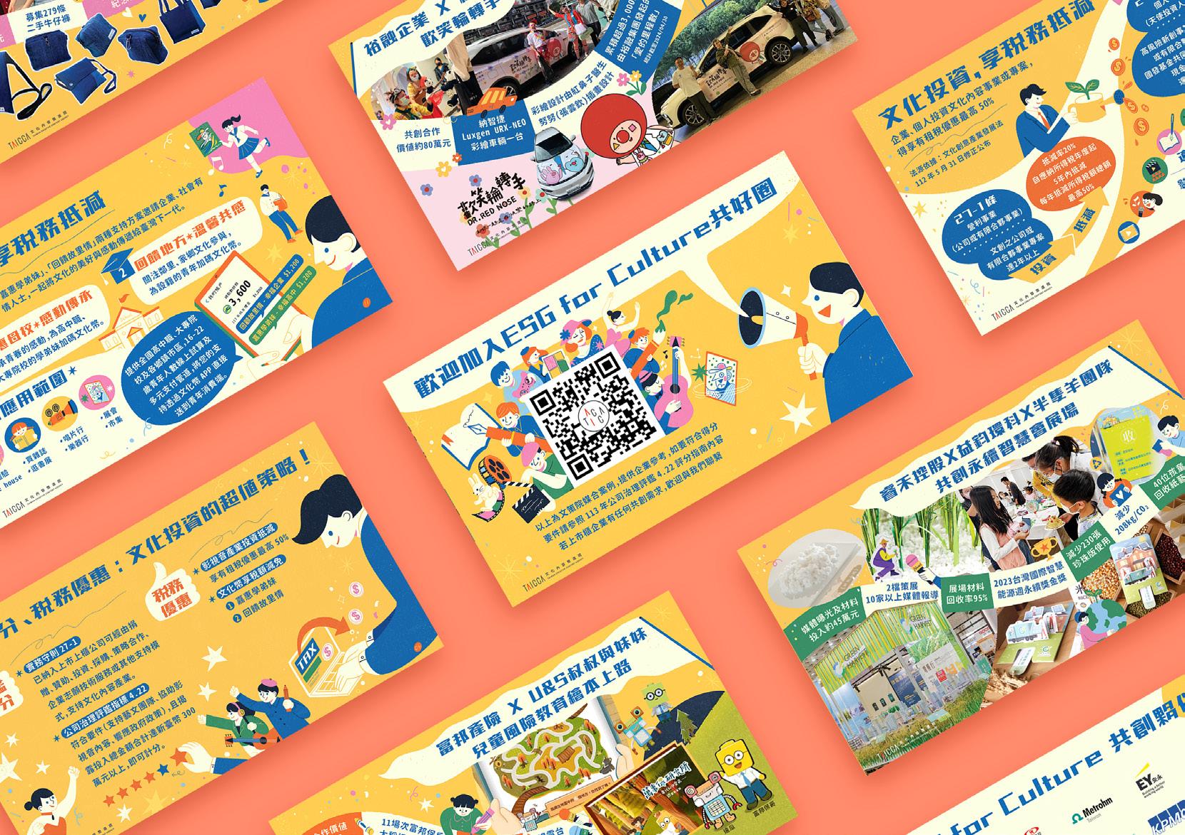與文策院合作的企業理念宣導設計,以平面插畫風格生動詮釋「ESG for Culture」的核心概念。