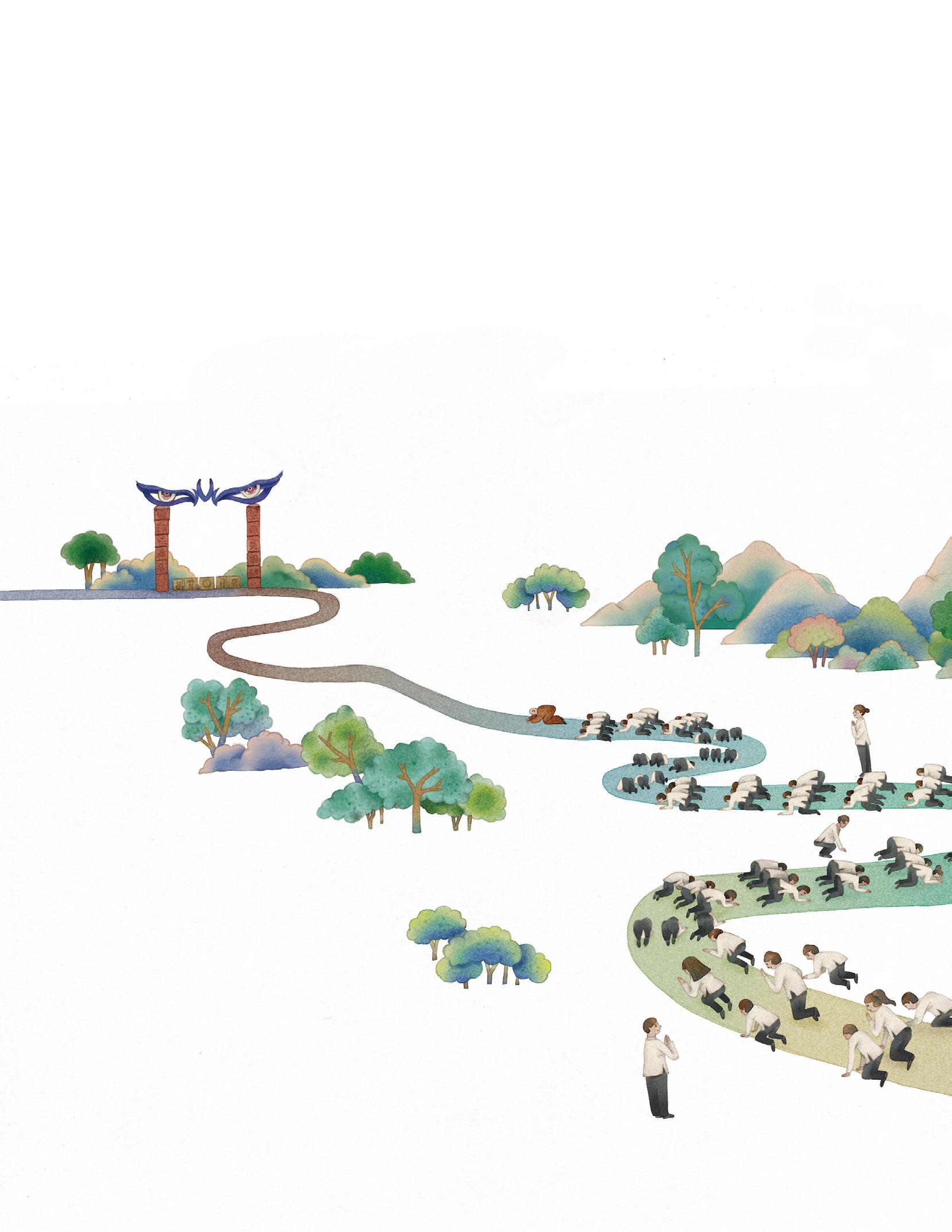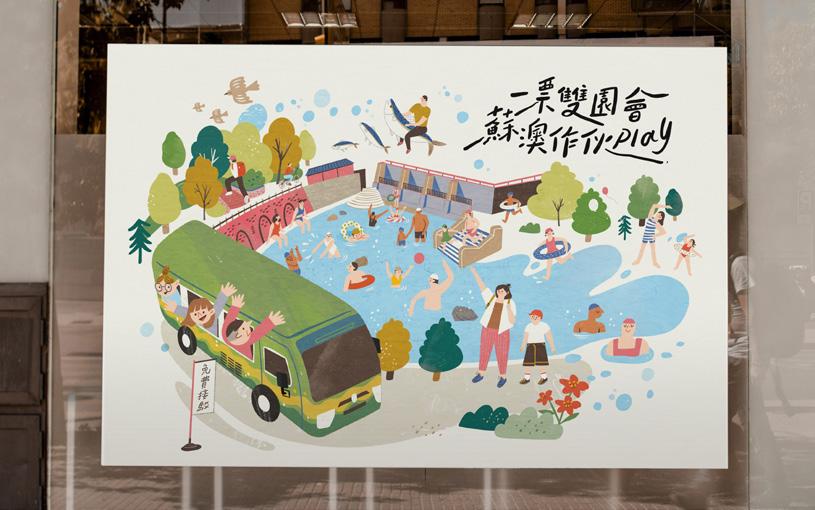 蘇澳冷泉主視覺插畫設 計,以冷泉的獨特景觀與 泡冷泉的人潮為主題,生 動描繪其造景特色與熱鬧 氛圍。