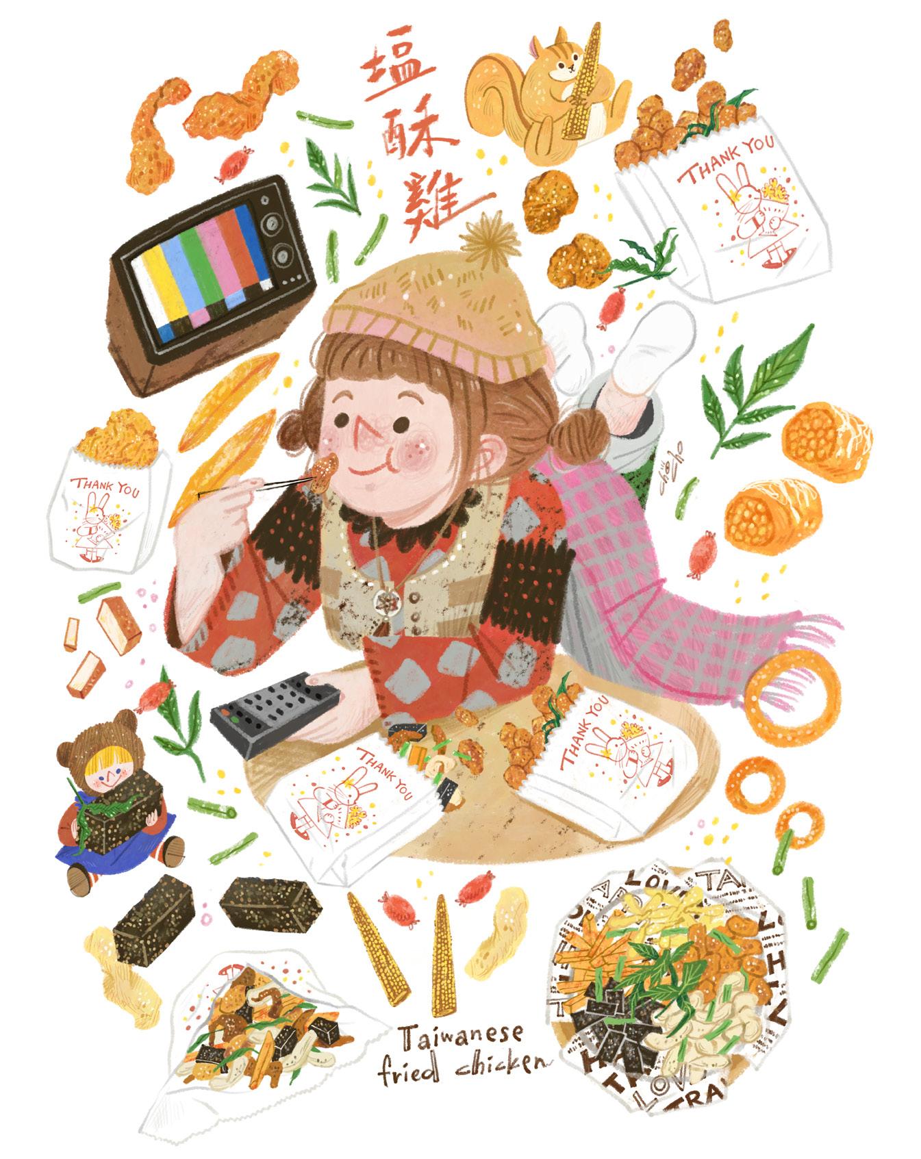 以IP角色「雀斑女孩」為主角,結合台灣美食文化創作出充滿溫度的插畫作品。透過雀 斑女孩親切溫暖的形象,融入在地文化元素,生動呈現台灣的美食魅力與人情味,讓觀者 在視覺享受中感受到台灣的溫暖與文化深度。