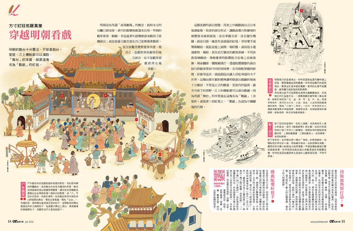 此插畫以「穿越時空來看戲」為主題,巧妙融合湯顯祖與莎士比亞的戲 劇世界,呈現中西方舞台設計的文化差異與藝術魅力。