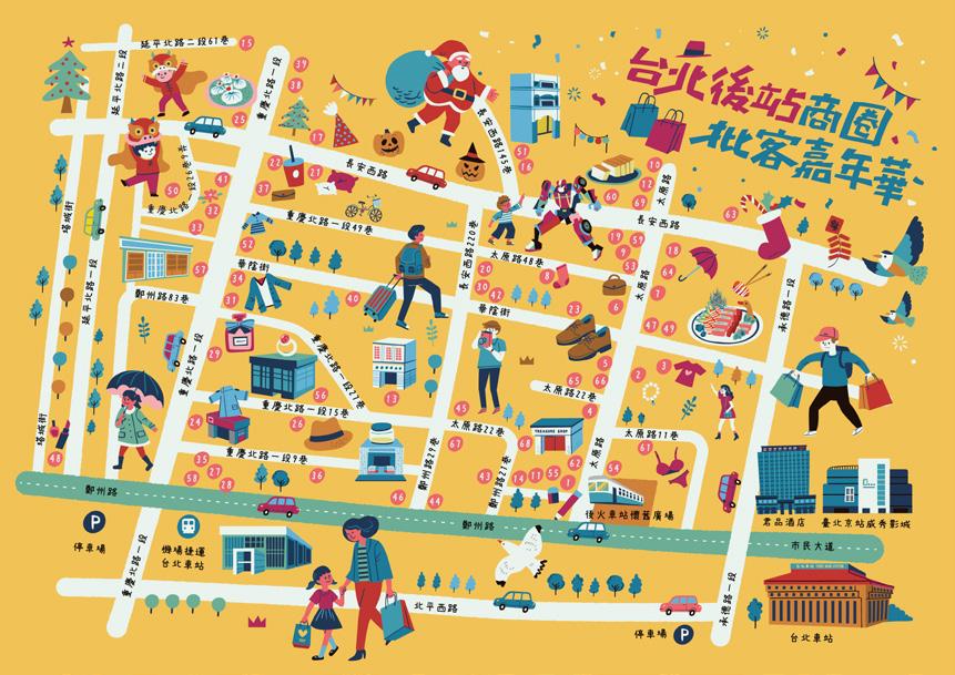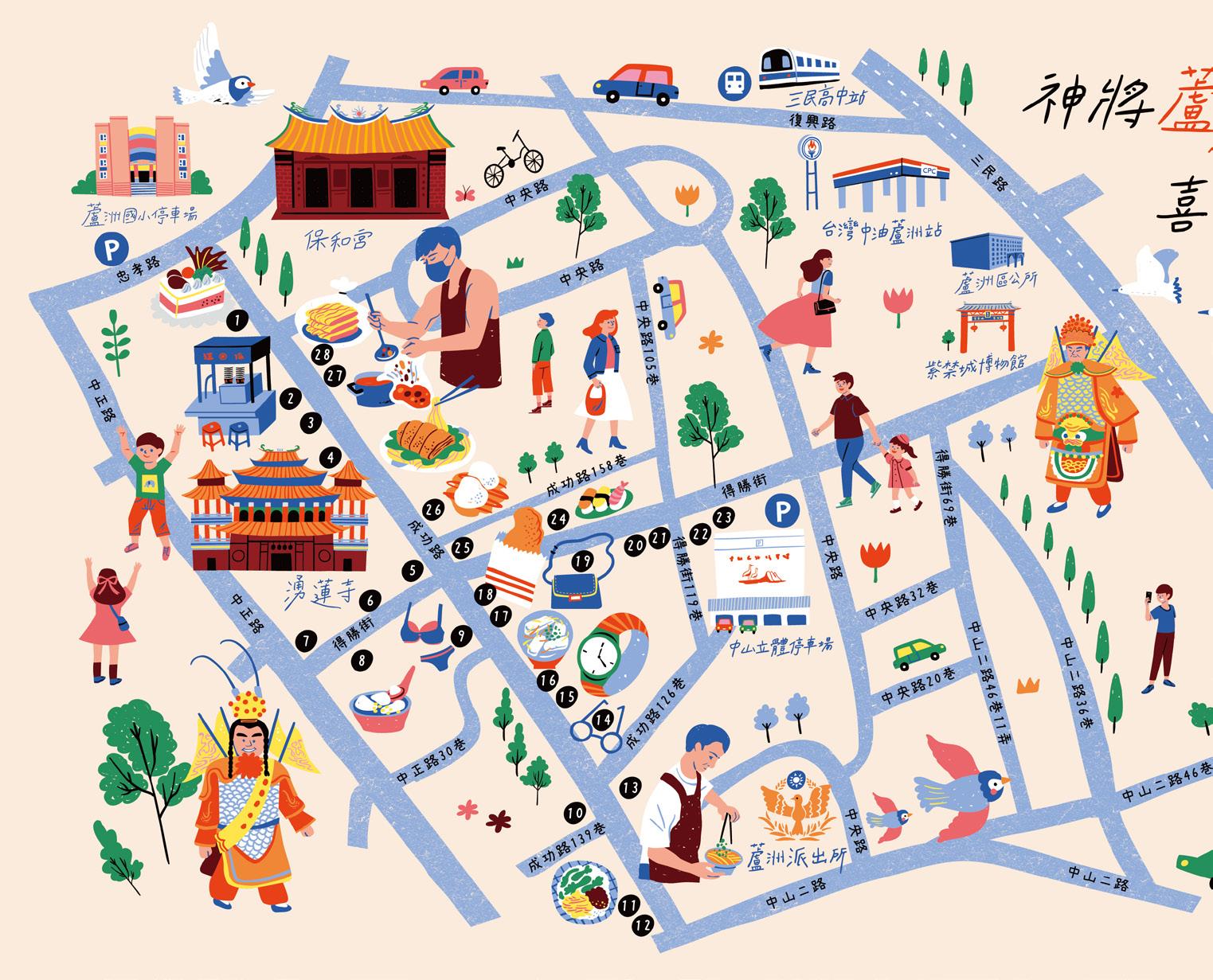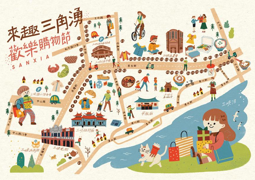 作品以平面插圖風格為基 底,結合當地特色與商家 元素,繪製出充滿地方風 情的地圖插畫,展現商圈 在地文化與創意活力。