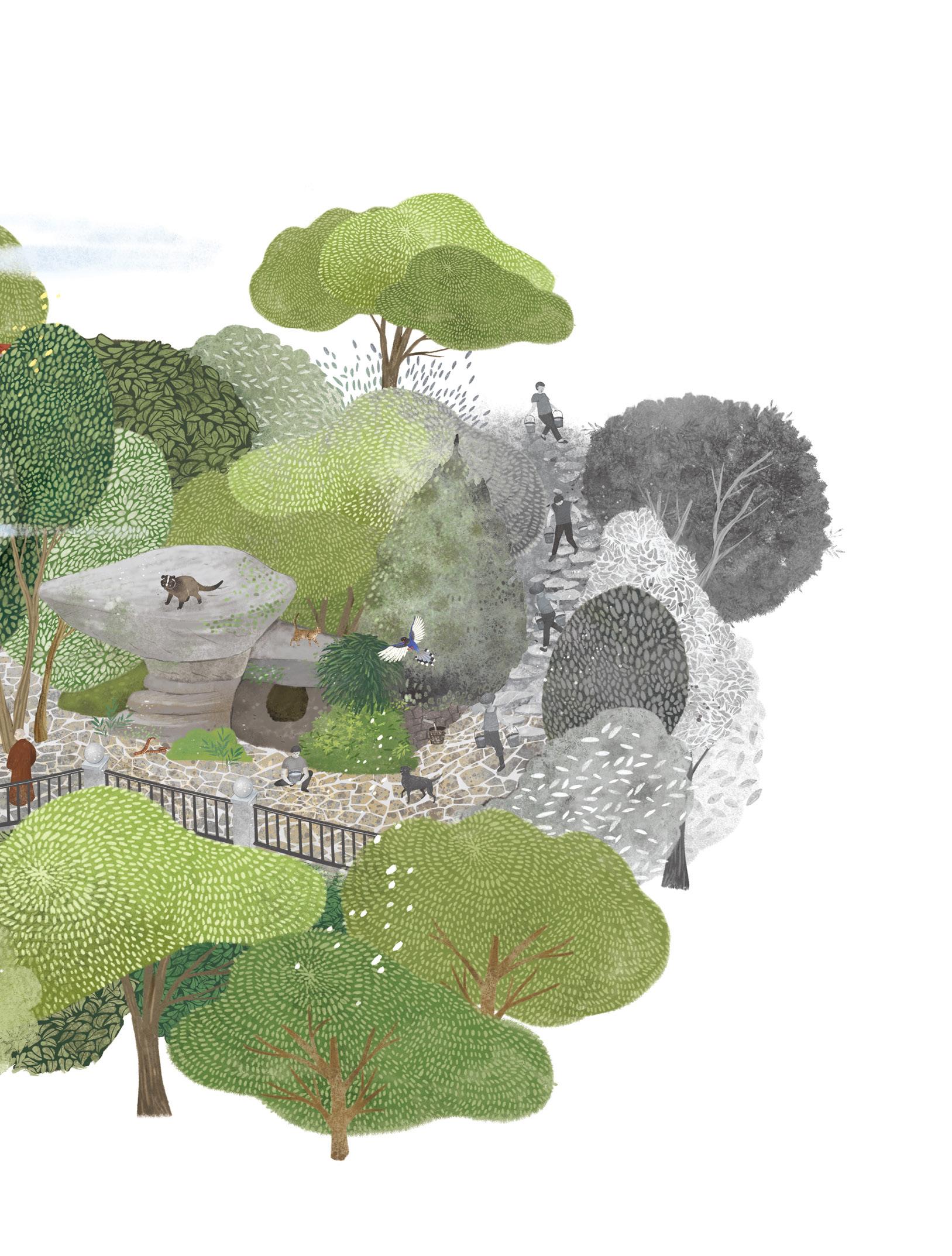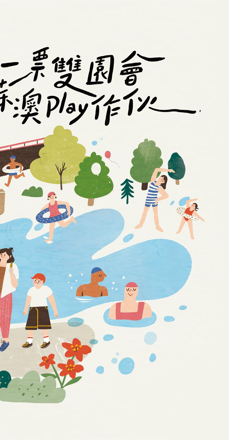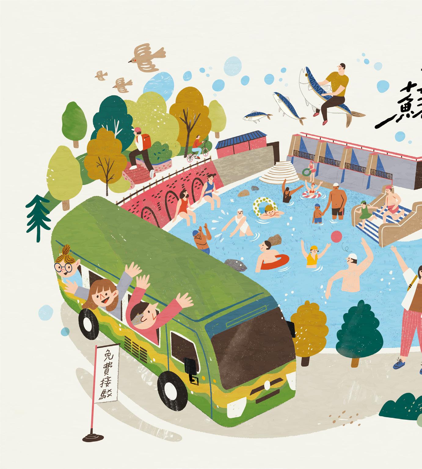 蘇澳冷泉主視覺插畫設 計,以冷泉的獨特景觀與 泡冷泉的人潮為主題,生 動描繪其造景特色與熱鬧 氛圍。