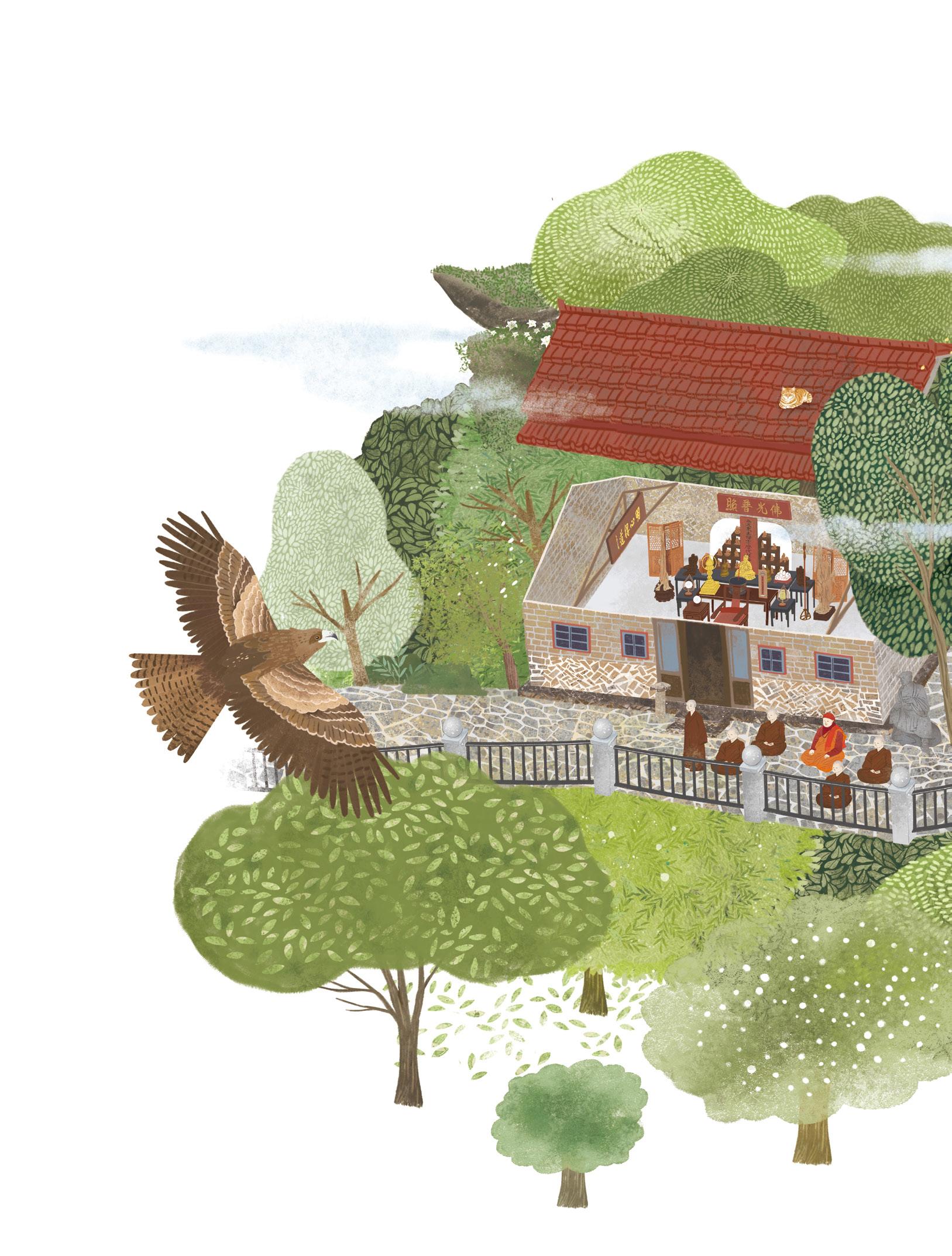 本書以導覽為初衷,透過插畫細膩詮釋自然與人文靈性空間之美。作 品將天地自然的和諧、人與人的共修精神,融會於有機生活的詩意之 中,展現共生共存的深邃意涵。