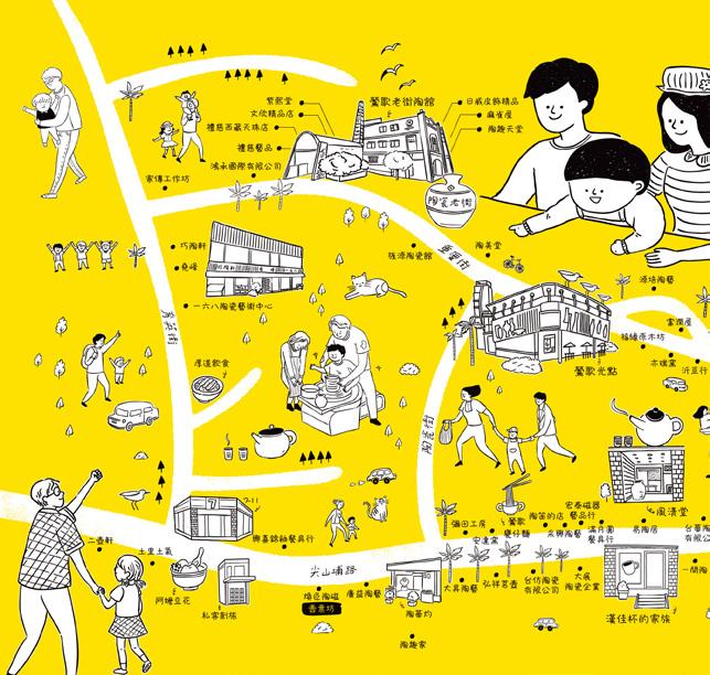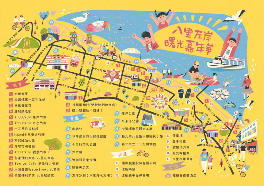 與台灣各地商圈攜手合 作,為台北後站、三角湧、 蘆洲、八里、鶯歌等地打 造專屬的主視覺插畫。