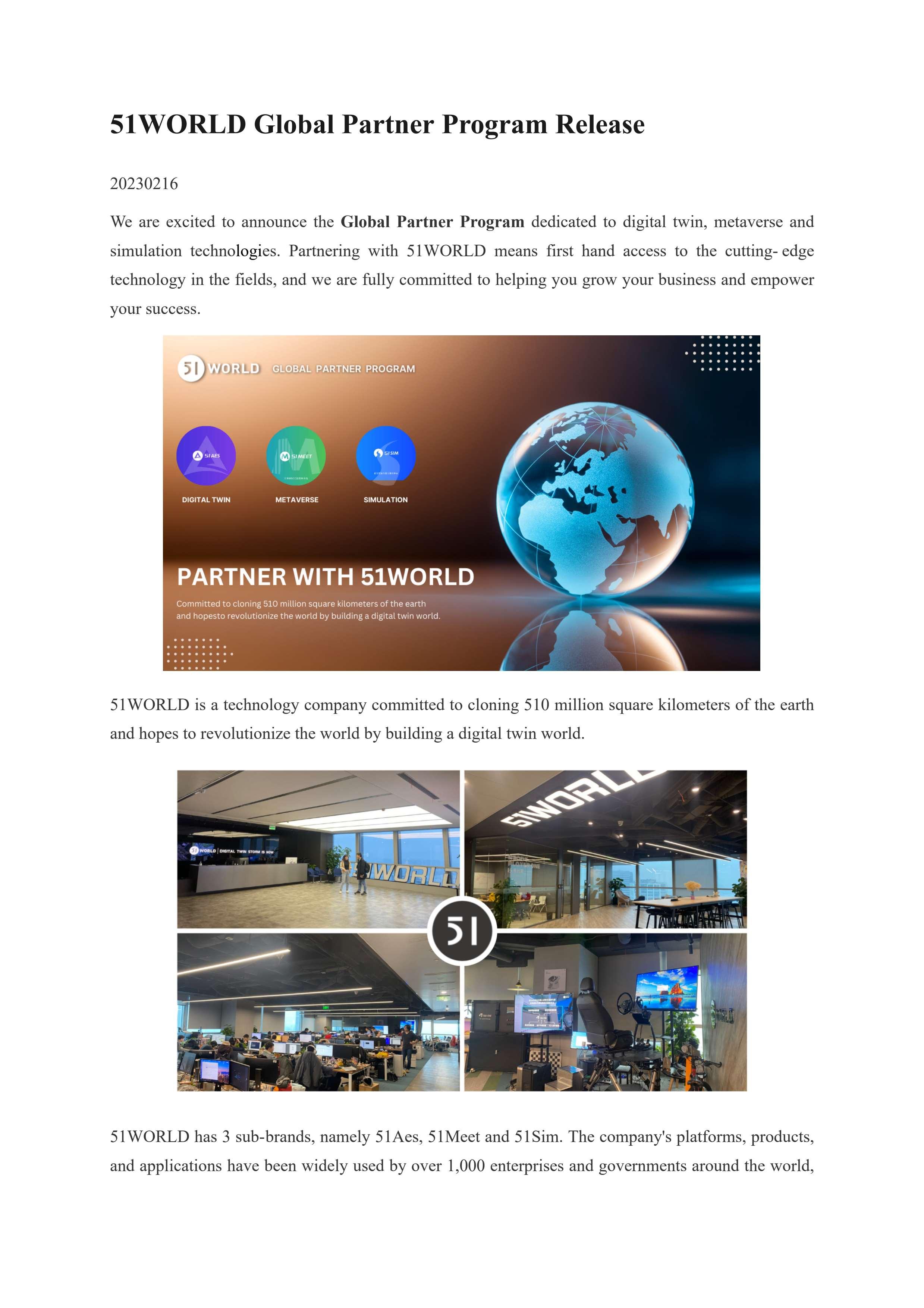 We are excited to announce the Global Partner Program dedicated to digital twin, metaverse and simulation technologies. Partnering with 51WORLD means first hand access to the cutting-edge technology in the fields, and we are fully committed to helping you grow your business and empower your success.