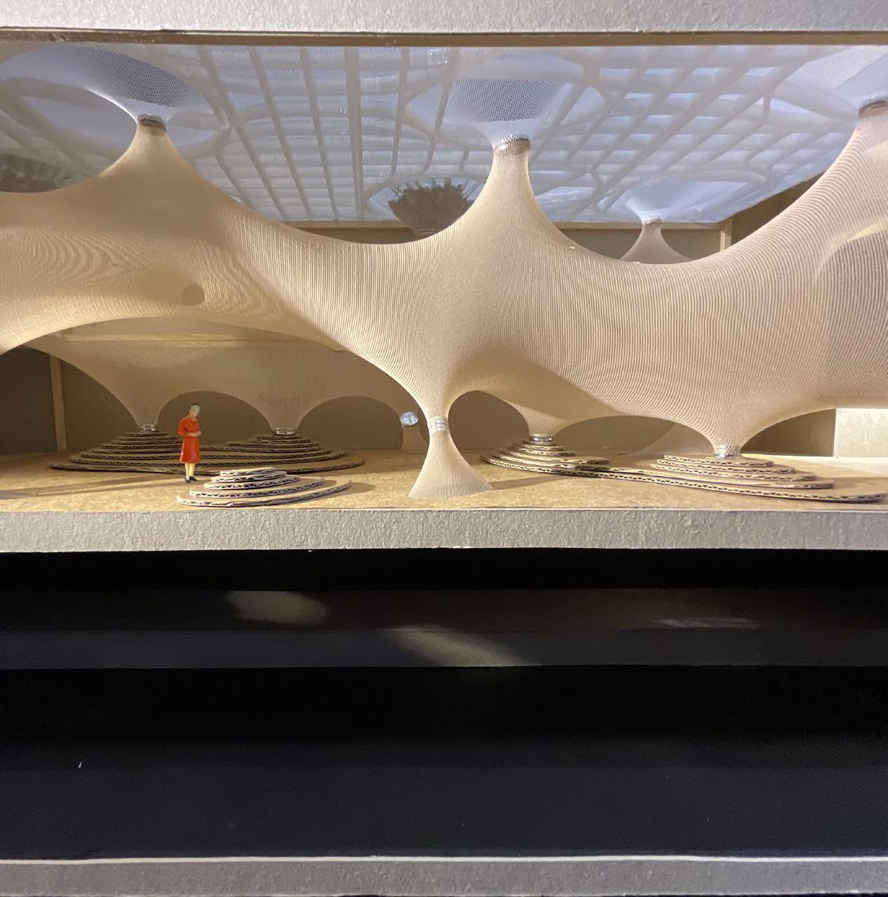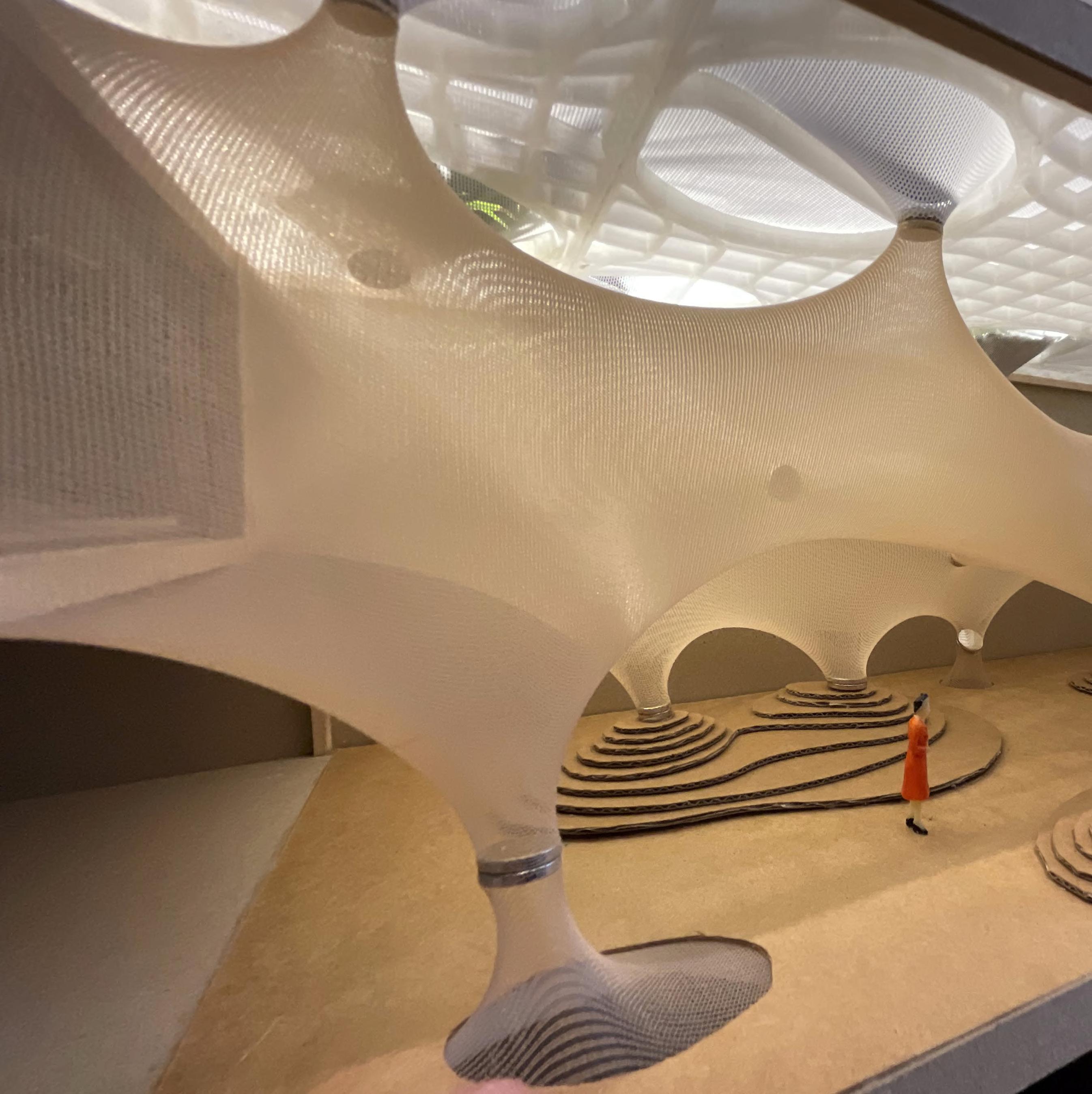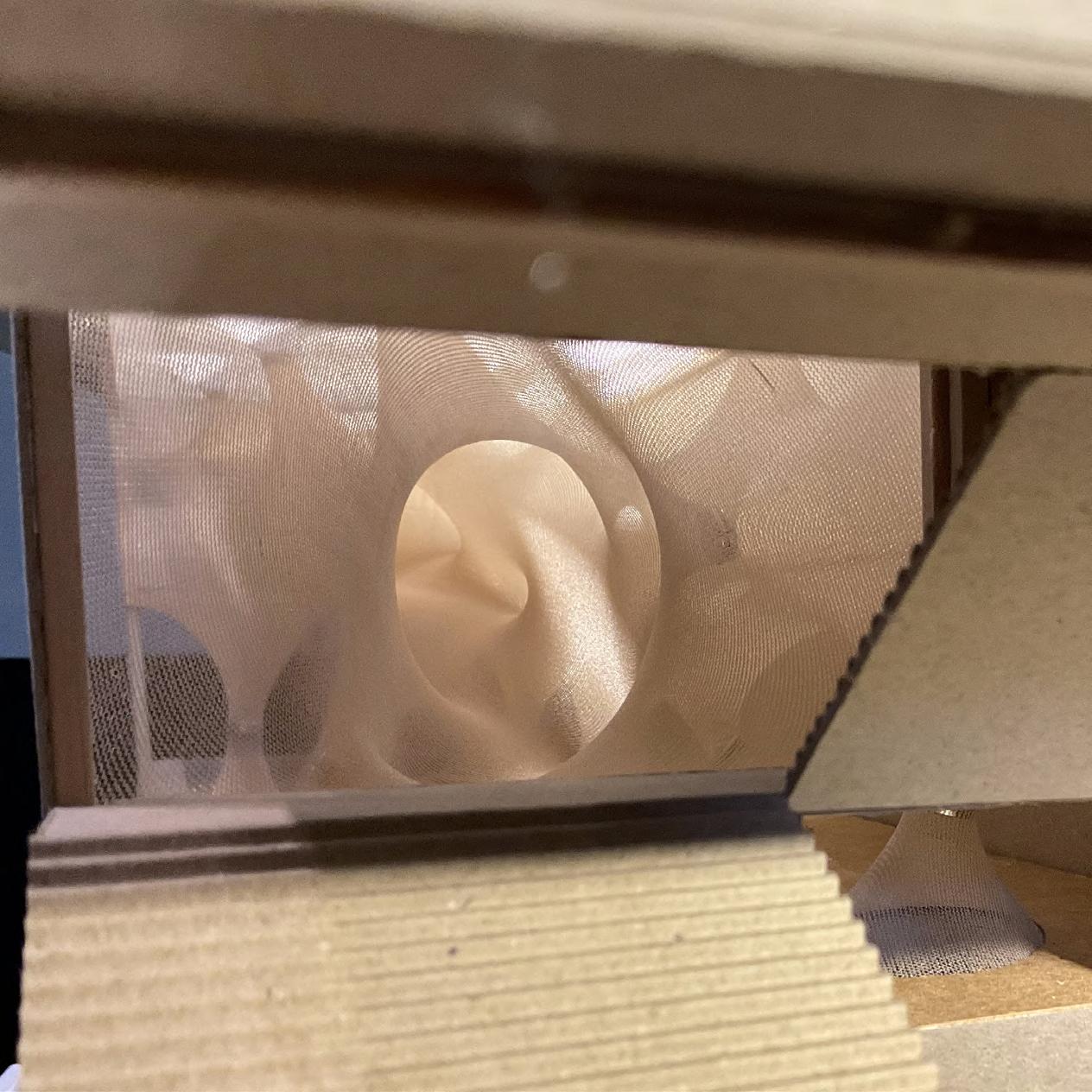 The fabric is a kind of material that can have multiple organic forms but also have many different levels of transparency because of the tension pull. It can create a lot of interesting and beautiful spaces just base one single material. It can allow the light to come inside the spaces, but also create the magnificent shadow outside the fabric at the same time.