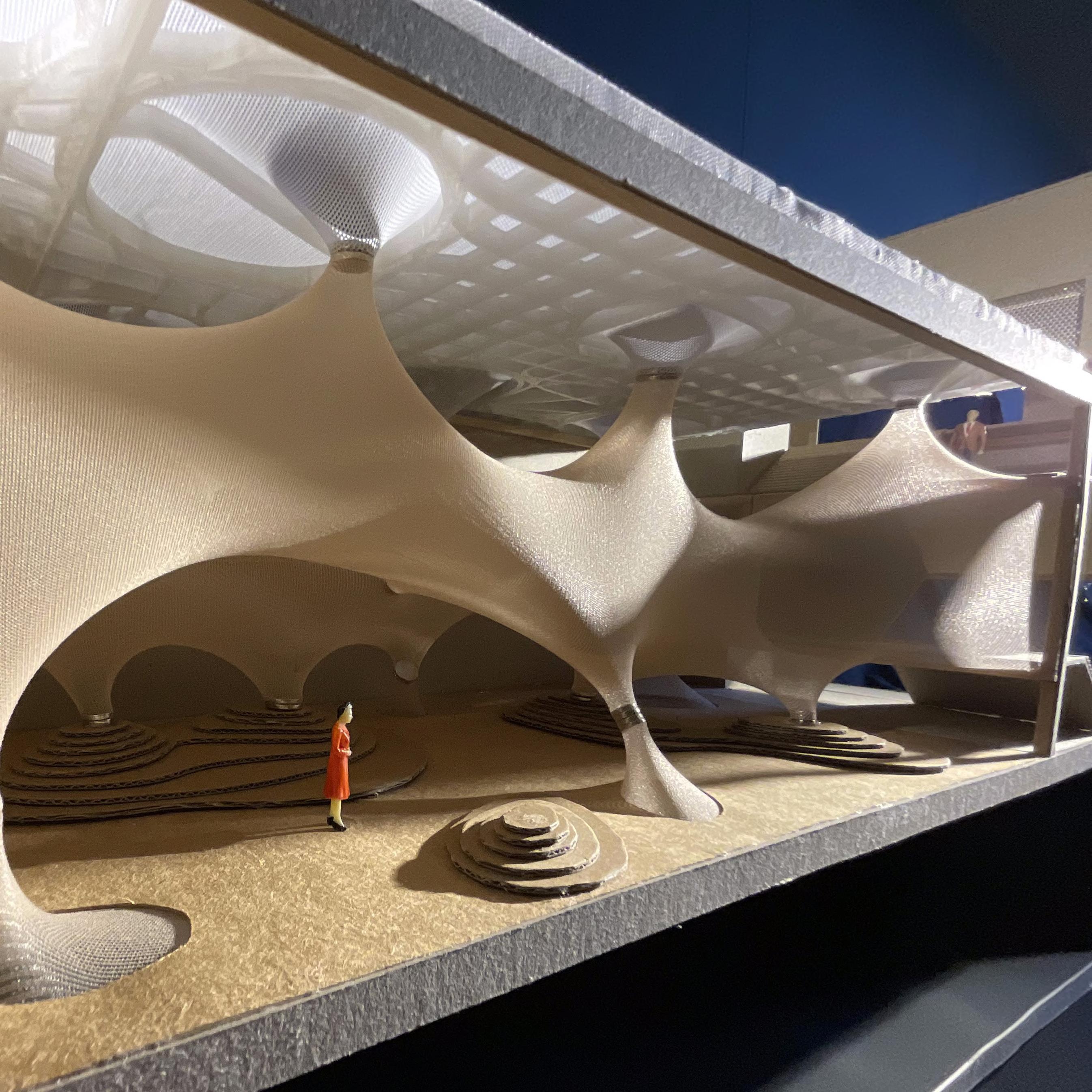 With the different levels of tension pull, we can also create a lot of different programs. If we slightly pull up, the space just become a soft couch in the city. If we have the curve line mirrored, it will become a container of light, collecting the brightness for the underground tunnel.