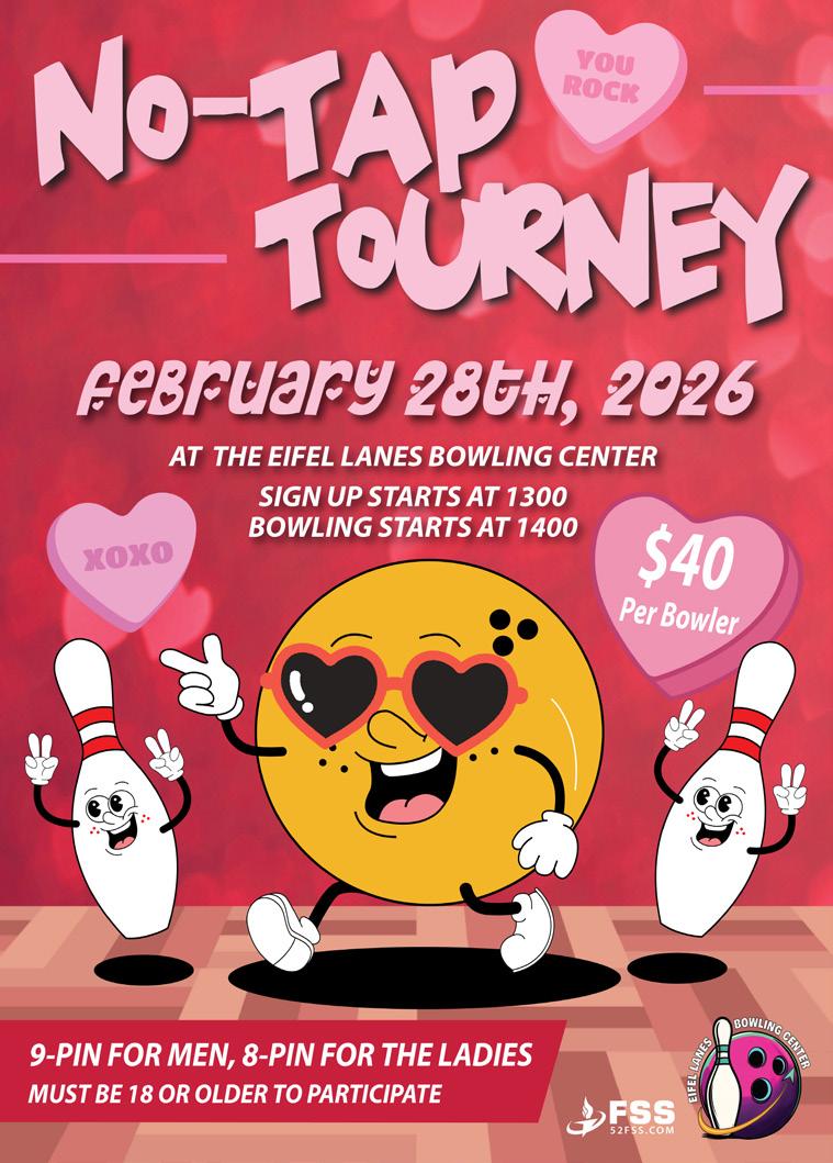 Bring the whole family for bowling fun! A perfect weekend activity for all ages. Bldg. 300 | DSN: 452-5020 OPEN Monday to Friday from 0700 - 1900