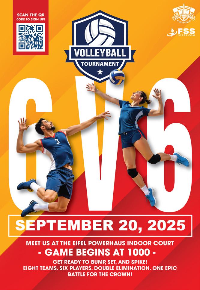 Meet us at the Eifel Powerhaus! Get ready to bump, set, and spike! Eight teams of 6 players. Double elimination rounds. One epic tournament. For more information contact the Fitness Center at DSN: 452-6714, see you there!