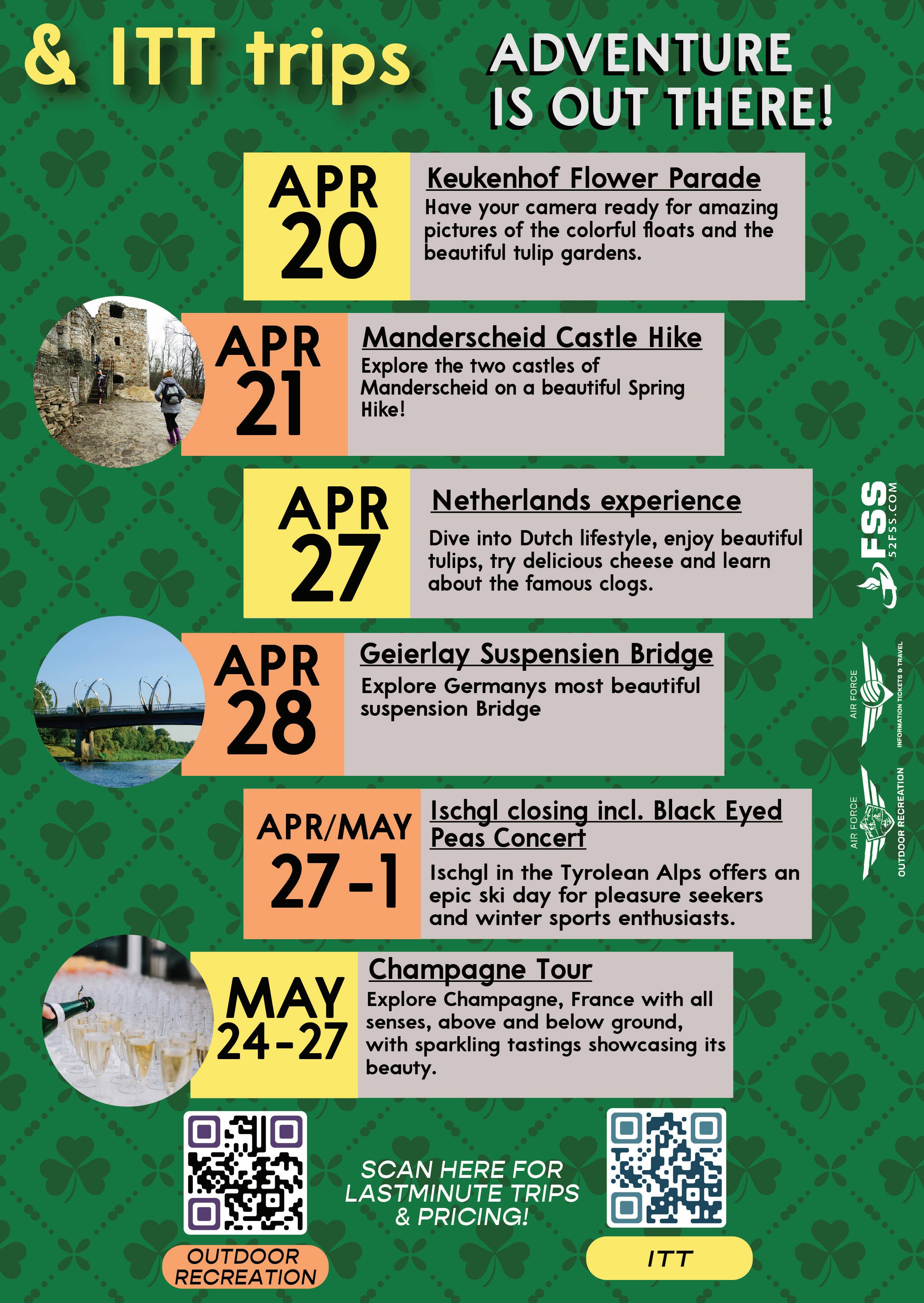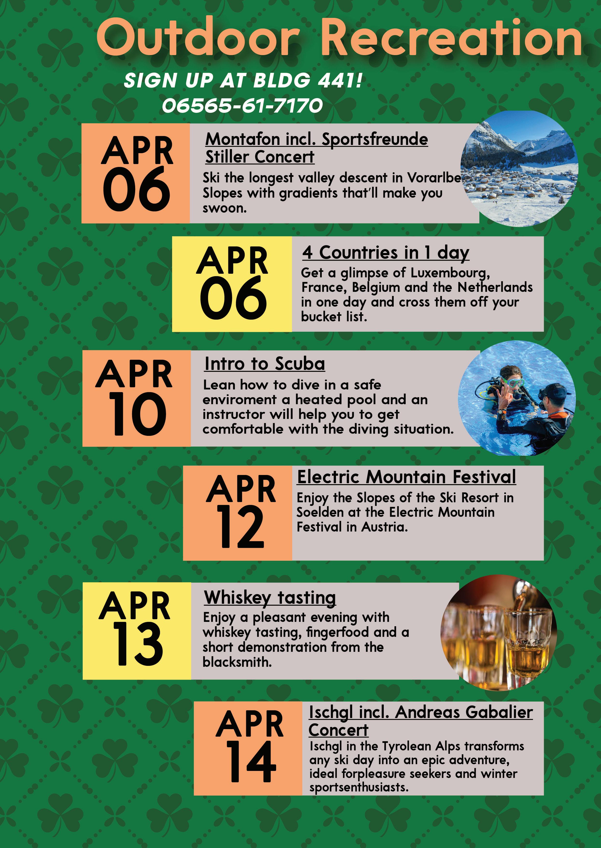 HAVE A QUESTION ABOUT ONE OF OUR FSS FACILITIES? Send us a message on Facebook at 52d Force Support Squadron. WHAT'S INSIDE? CONTENTS OF THE FLASH ARE NOT NECESSARILY THE OFFICIAL VIEWS OF OR ENDORSED BY THE U.S. GOVERNMENT, 52D FORCE SUPPORT SQUADRON, DEPARTMENT OF DEFENCE OR DEPARTMENT OF THE AIR FORCE. CONTENT IS EDITED, PREPARED AND PROVIDED BY THE MARKETING DEPARTMENT. NO FEDERAL ENDORSEMENT OF SPONSORS OR ADVERTISERS IS INTENDED. ALL MATERIALS ARE COPYRIGHT OF THE 52D FORCE SUPPORT SQUADRON. REPRODUCTION OF ADVERTISEMENTS IS UNLAWFUL WITHOUT WRITTEN CONSENT. 4 EIFEL LANES BOWLING FITNESS CENTER 6 MILITARY & FAMILY READINESS 8 AUTO HOBBY SHOP PLAQUES PLUS FRAMING & ENGRAVING CRAFTS & PARTY CENTRAL 10 YOUTH PROGRAMS 12 OUTDOOR RECREATION 13 INFORMATION, TICKETS & TRAVEL 14 SPANGDAHLEM LIBRARY EIFEL MOUNTAIN GOLF COURSE 16 CLUB EIFEL • THE LOUNGE 18 & 19 DIRECTORY FRONT COVER: OLD MAN OF STORR, ISLE OF SKYE, SCOTLAND MARKETING TEAM 52D FORCE SUPPORT SQUADRON