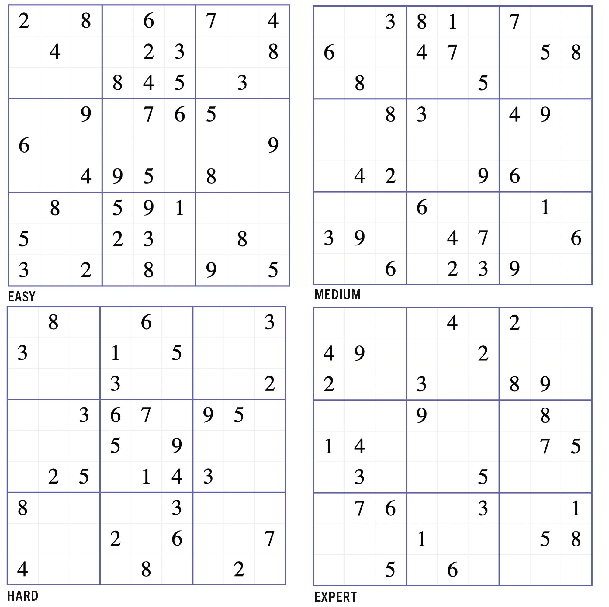SUDOKU puzzles have one solution that can be reached logically without guessing. Enter digits from 1 to 9 into the blank spaces. Every row, column, and 3x3 square must contain one of each digit.