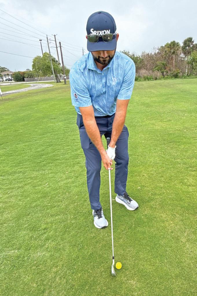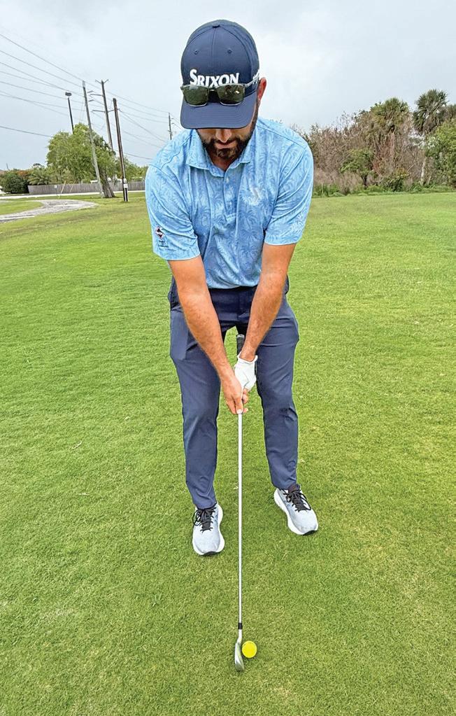 Next, move the ball 2 inches back in your stance. This reduces the effective loft of the club and helps produce a lower shot. It will also tend to close your shoulders to the target. Finally, pull your lead foot back 2 inches to create a slightly open stance. This squares your shoulders back to the target and naturally shortens your backswing, which helps keep the ball flight down even more.