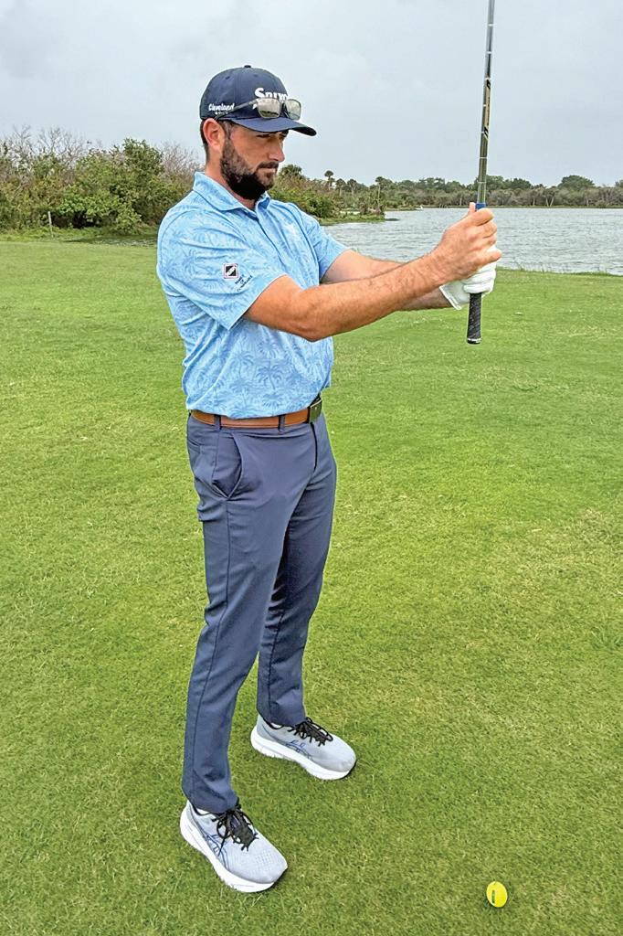 Start by gripping down on the club about 2 inches. This effectively stiffens the shaft, helping to lower the flight, and gives you a little more control.