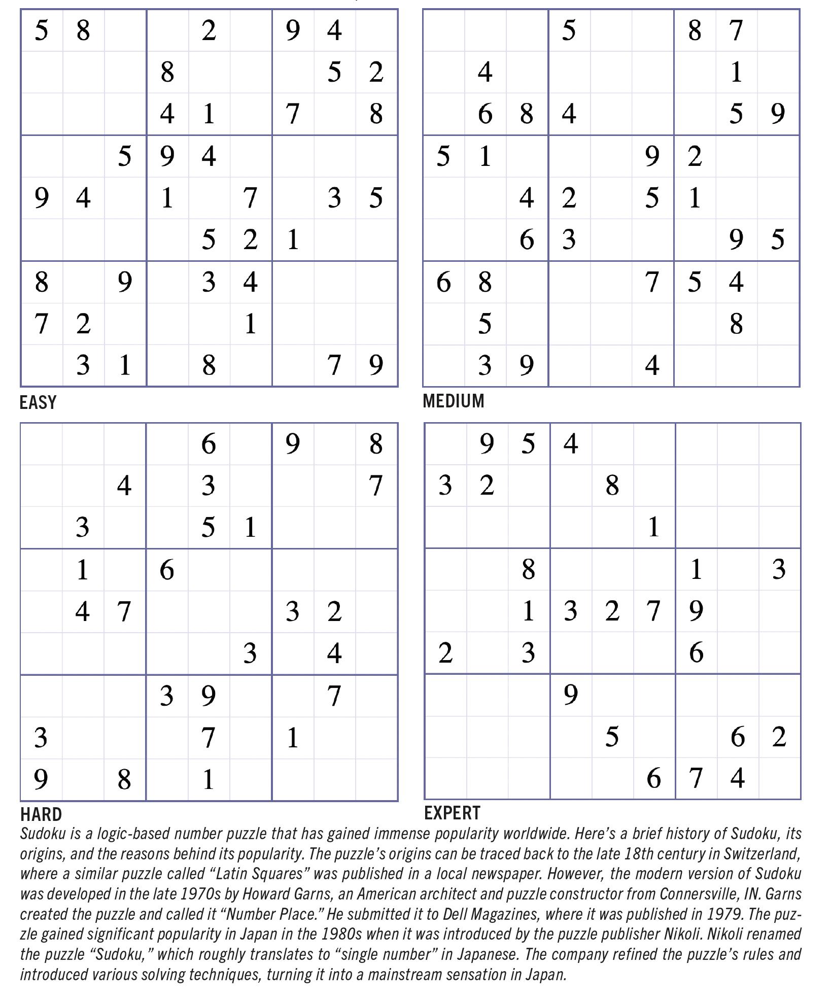 SUDOKU puzzles have one solution that can be reached logically without guessing. Enter digits from 1 to 9 into the blank spaces. Every row, column, and 3x3 square must contain one of each digit.