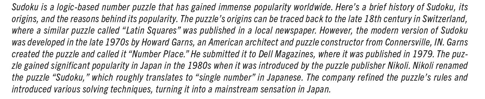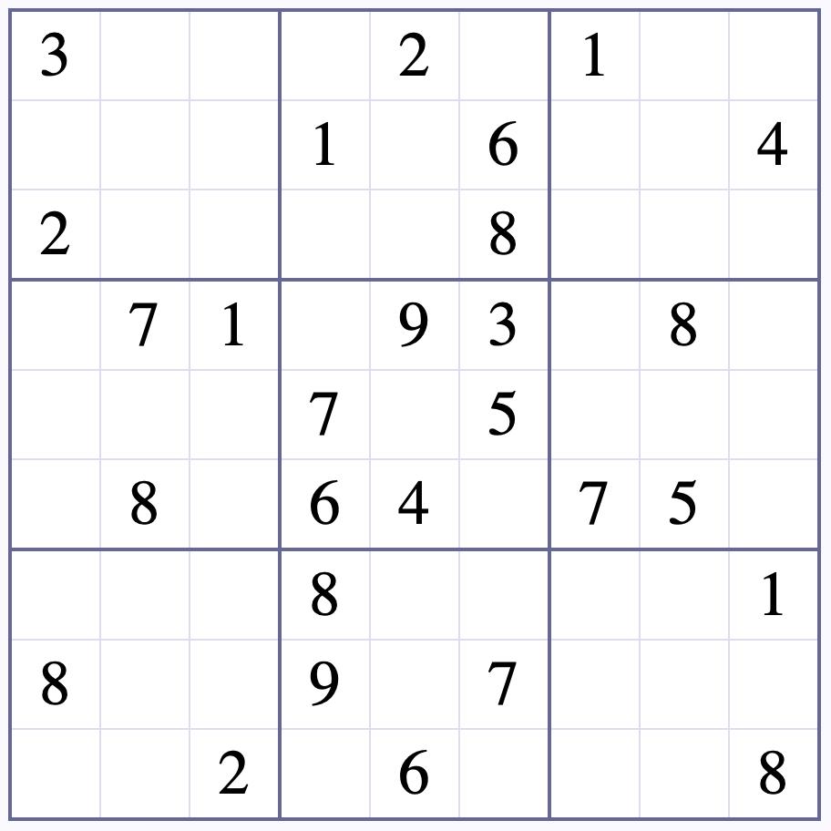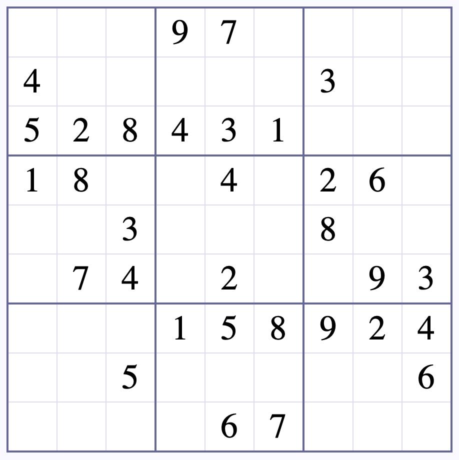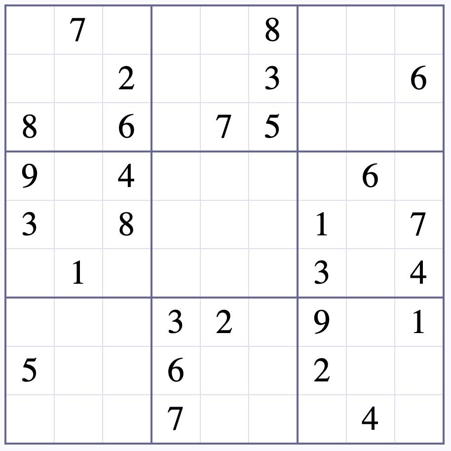 SUDOKU puzzles have one solution that can be reached logically without guessing. Enter digits from 1 to 9 into the blank spaces. Every row, column, and 3x3 square must contain one of each digit.