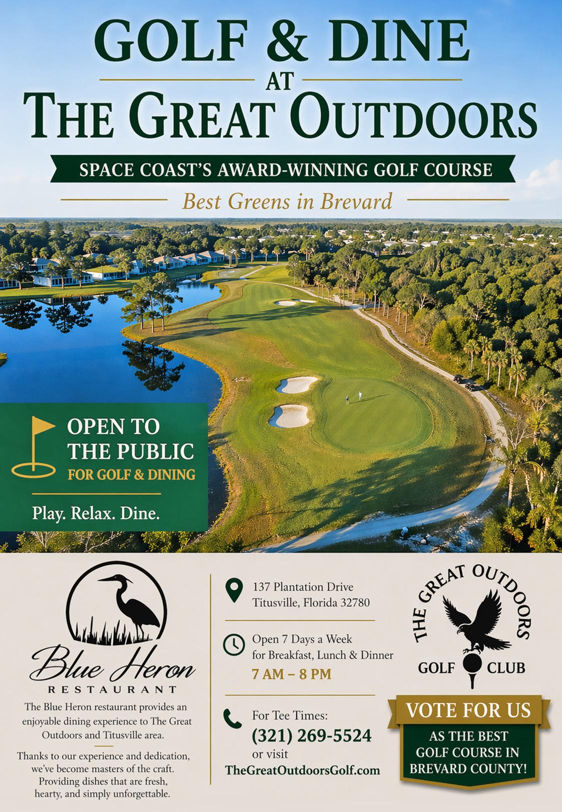 I’m excited to share that The Great Outdoors Golf Club has officially made it into the Top 5 of the Best of Brevard Community Choice Awards! This recognition is a huge accomplishment and a true reflection of the incredible support from our community, members, and guests. The voting period will be from May 11 through May 25. Please review the voting instructions on page 11 or through notices you’ll receive via alert media and by scanning the QR code on the flyer.