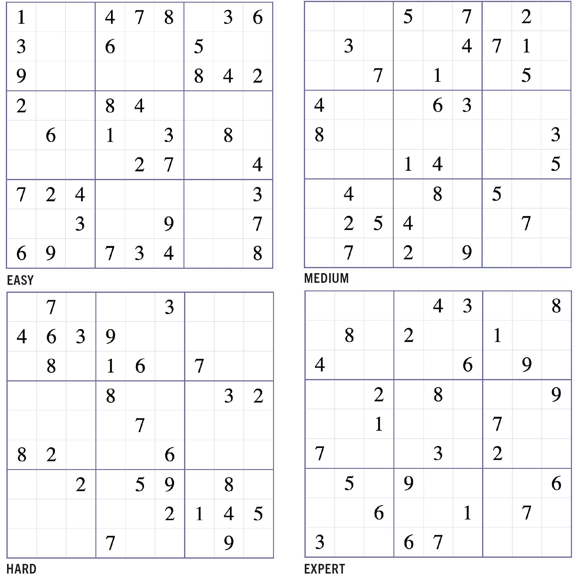 SUDOKU puzzles have one solution that can be reached logically without guessing. Enter digits from 1 to 9 into the blank spaces. Every row, column, and 3x3 square must contain one of each digit.