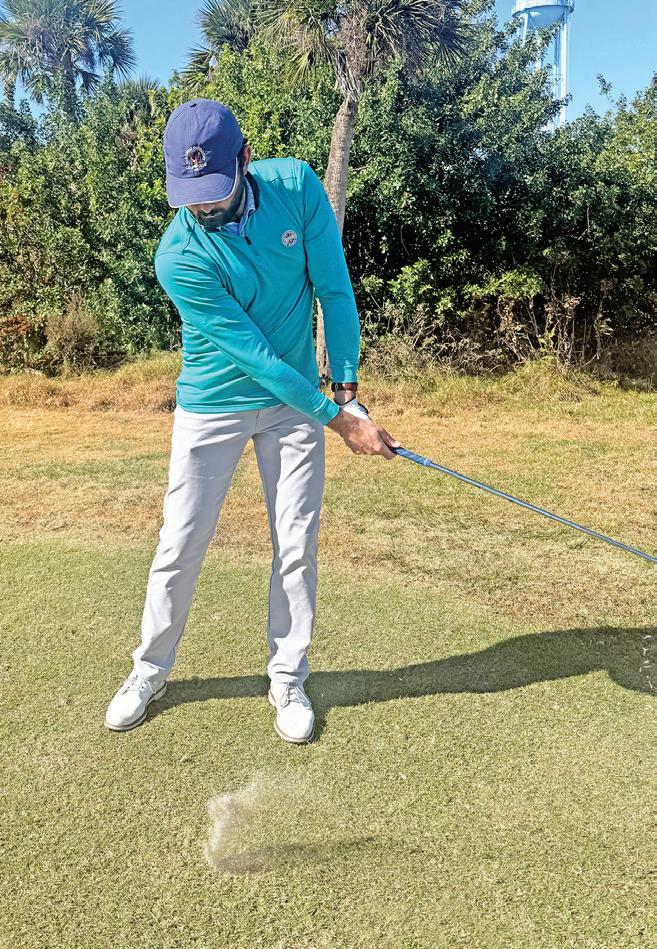 From the top of the backswing, the first move is a squat and turn. The hips move toward square with the target line as the arms drop the club into the delivery position. The core engages, creating a stable “post” to swing around. From there, the arms can whip the club through the ball, with the body naturally turning to the target afterward.