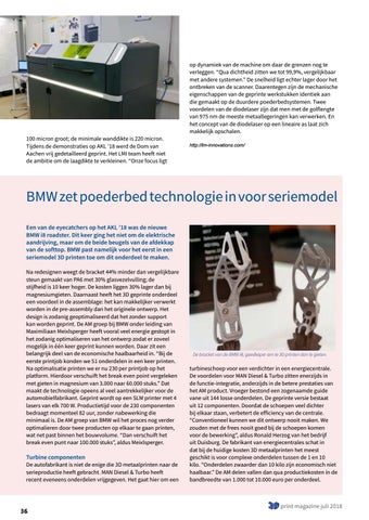 op dynamiek van de machine om daar de grenzen nog te verleggen. “Qua dichtheid zitten we tot 99,9%, vergelijkbaar met andere systemen.” De snelheid ligt echter lager door het ontbreken van de scanner. Daarentegen zijn de mechanische eigenschappen van de geprinte werkstukken identiek aan die gemaakt op de duurdere poederbedsystemen. Twee voordelen van de diodelaser zijn dat men met de golflengte van 975 nm de meeste metaallegeringen kan verwerken. En het concept van de diodelaser op een lineaire as laat zich makkelijk opschalen. 100 micron groot; de minimale wanddikte is 220 micron. Tijdens de demonstraties op AKL ’18 werd de Dom van Aachen vrij gedetailleerd geprint. Het LMI team heeft niet de ambitie om de laagdikte te verkleinen. “Onze focus ligt