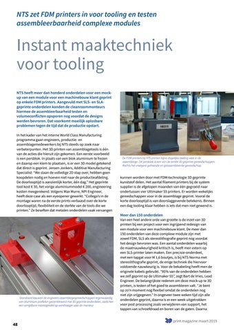 Instant maaktechniek voor tooling NTS heeft meer dan honderd onderdelen voor een mockup van een module voor een machinebouw klant geprint op enkele FDM printers. Aangevuld met SLS- en SLAgeprinte onderdelen konden de cleanroommonteurs hiermee de assembleerbaarheid testen en volumeconflicten opsporen nog voordat de designs werden bevroren. Dat voorkomt moeilijk oplosbare problemen tegen de tijd dat de productie opstart. In het kader van het interne World Class Manufacturing programma gaan engineers, productie- en assemblagemedewerkers bij NTS steeds op zoek naar verbeterpunten. Het 3D printen van assemblagetools is één van de acties die hieruit zijn gekomen. Een eerste voorbeeld is een persblok. In plaats van een blok aluminium te frezen en daarop een klem te plaatsen, is er een 3D model getekend dat direct is geprint. Jeroen Jonkers, Additive Manufacturing Specialist: “We slaan de volledige 2D stap over, hebben geen koopdelen nodig en hoeven niet naar de productieafdeling. De doorlooptijd is aanzienlijk korter, één dag.” Het geprinte tool kost € 30, het vorige aluminiummodel € 200, engineering kosten meegerekend. Volgens Max Murre, NPI Engineer, heeft deze case als een eyeopener gewerkt. “Collega’s in de montage waren na de eerste prints verbaasd over de korte doorlooptijd, flexibiliteit en de sterkte van de tools die we printen.” Ze beseften dat metalen onderdelen vaak vervangen