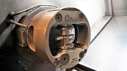 tomatiseringsoplossing van Roboflex. Om de kruisstukken aan vier zijden te bewerken, wordt gebruik gemaakt van een bijzondere indexeerbare zwenkklauwplaat. Zodra dat is gebeurd, verplaatst de robot het onderdeel naar een meerspillig boorstation waar automatisch de gaten in de astap worden geboord. Daarna worden de kruisstukken middels een glijgoot afgevoerd naar een opvangkrat.