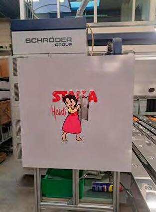 Heidi belt naar huis Zwenkbuigmachine Heidi wordt gewaardeerd door het productieteam. Haar automatiseringsgraad, bediening en gereedschapswisselaar maken haar bijzonder efficiënt. De onderdelen voor 10 dakluiken en minstens 30 kasten worden dagelijks op de machine gebogen, vaak in seriegrootte 1, omdat de orders via het internetportaal van Staka klantgericht worden geconfigureerd. Het digitale proces van de werkvoorbereiding is efficiënt en de POS 3000 3D-grafische machinebesturing ondersteunt bijvoorbeeld door de buigprogramma’s te organiseren in families van vergelijkbare componenten en door de benodigde buighoekaanpassing per batch roestvrij staalplaat op te slaan om de terugvering te compenseren. Er is ook ondersteuning door de medewerkers van de Schröder Group. Zelfs