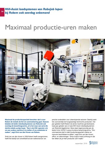 precisie-onderdelen voor uiteenlopende sectoren. Daarbij zoekt het voornamelijk de hoogwaardige technische producten. Vier jaar geleden heeft Rokem de eerste machines gerobotiseerd, twee jaar geleden zijn er twee Mill-Assist robotlaadsystemen van RoboJob bijgekomen. Deze staan tegenwoordig aan de beide Victor AX350 5-assig simultane bewerkingscentra. “Ons voornaamste doel is méér productiecapaciteit creëren en manuren beschikbaar te stellen”, zegt Chris van den Hoven, office- en salesmanager. “Onze output moest omhoog en dat kan alleen als je meer productie-uren maakt.” september 2018