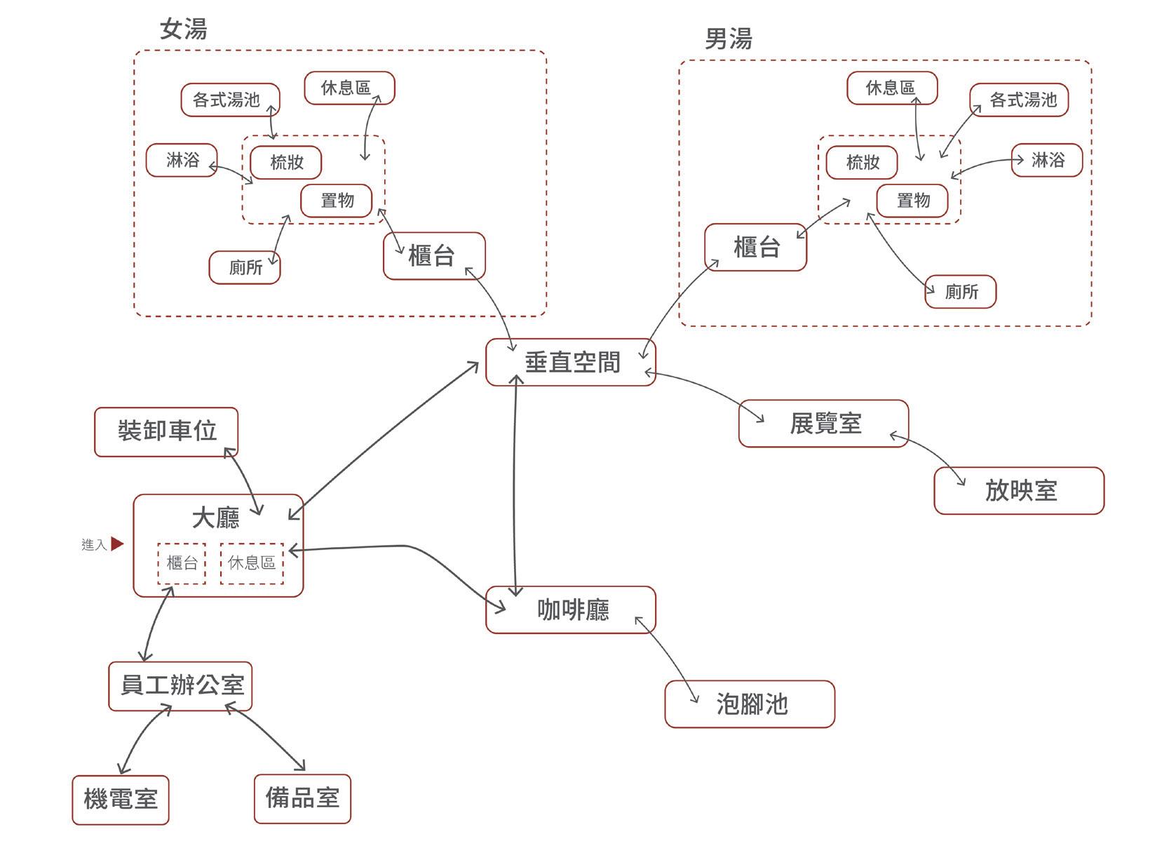 身體與光與水的關係總是非常的緊密,而都市當中身體又與空間的會 產生很多化學變化;本次設計以自身觀察基地周遭的感知作為出發點, 將感知到的「迷走」融入空間體驗,並將泡湯的過程與迷走的過程相 互交融,產生再建築裡發生迷走的過程。