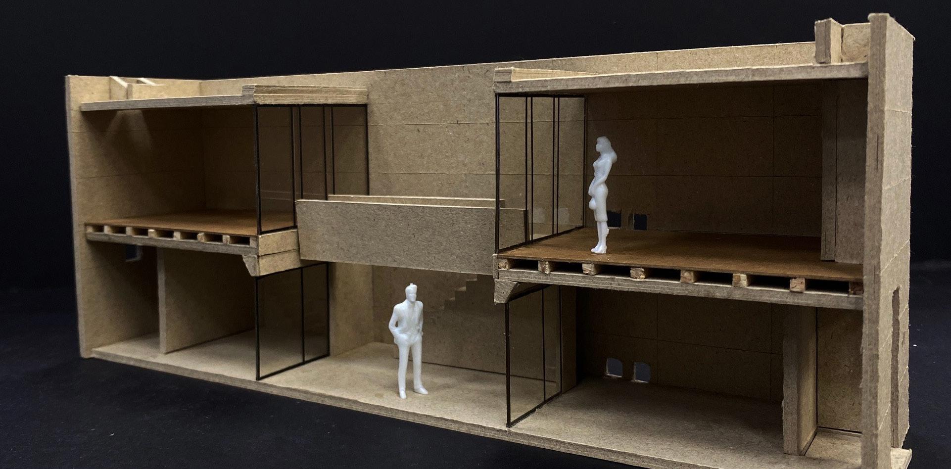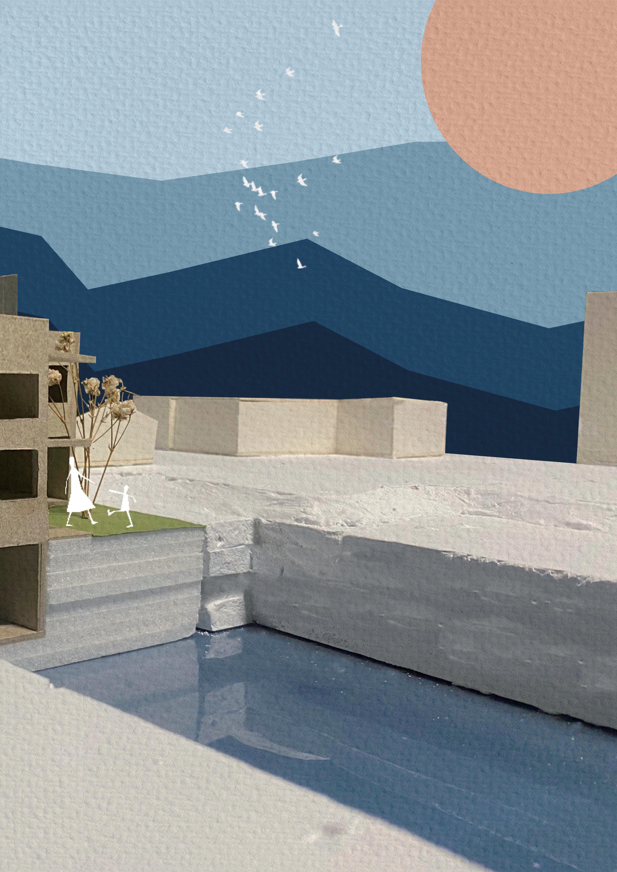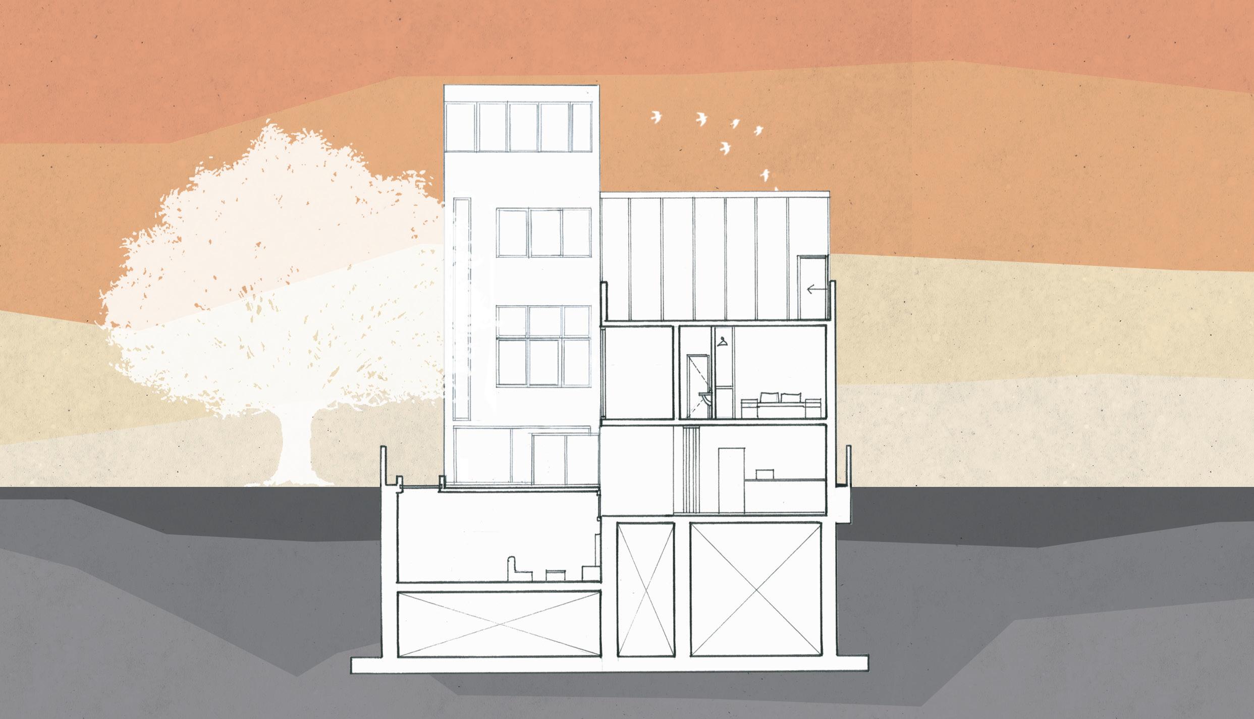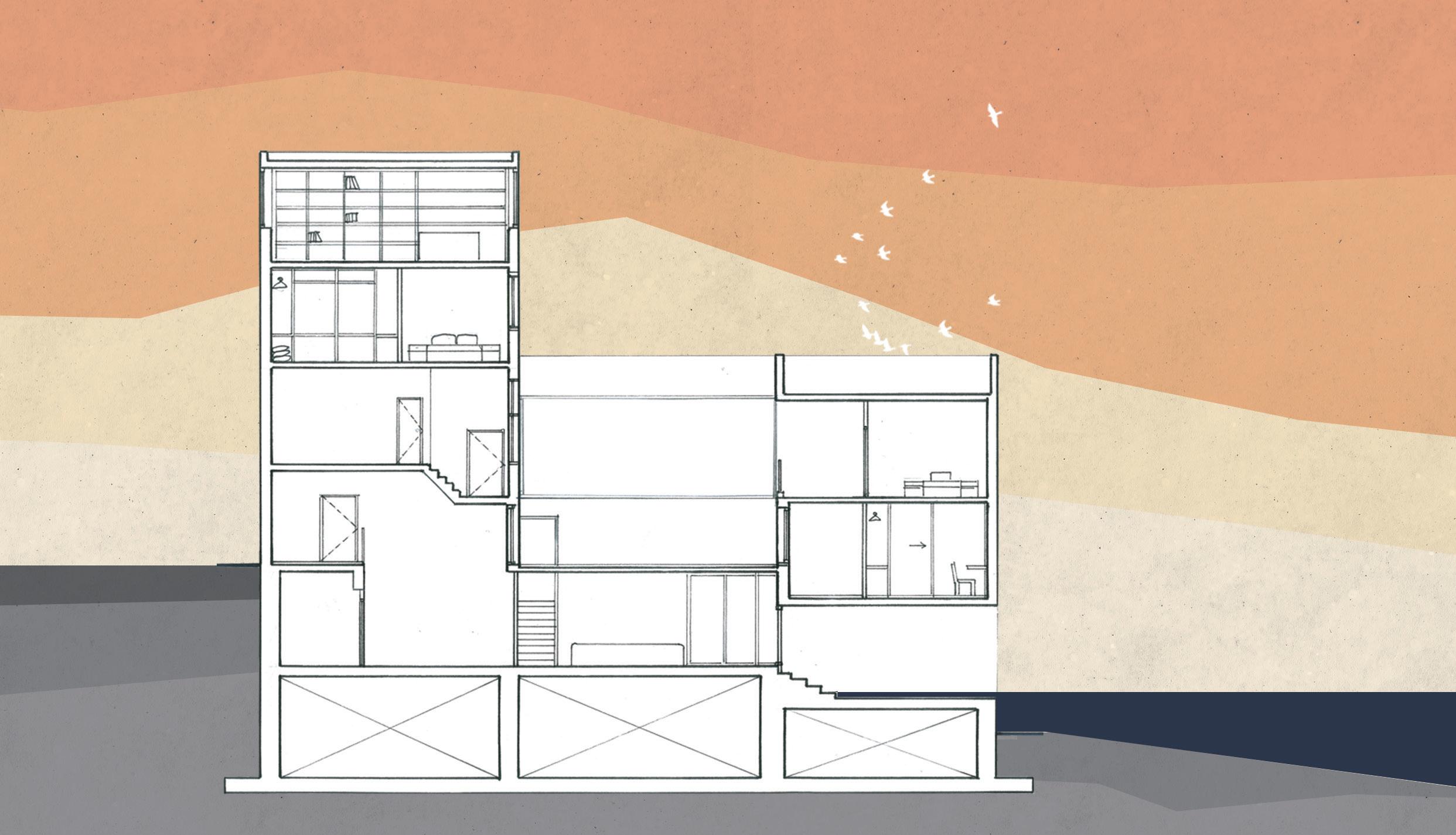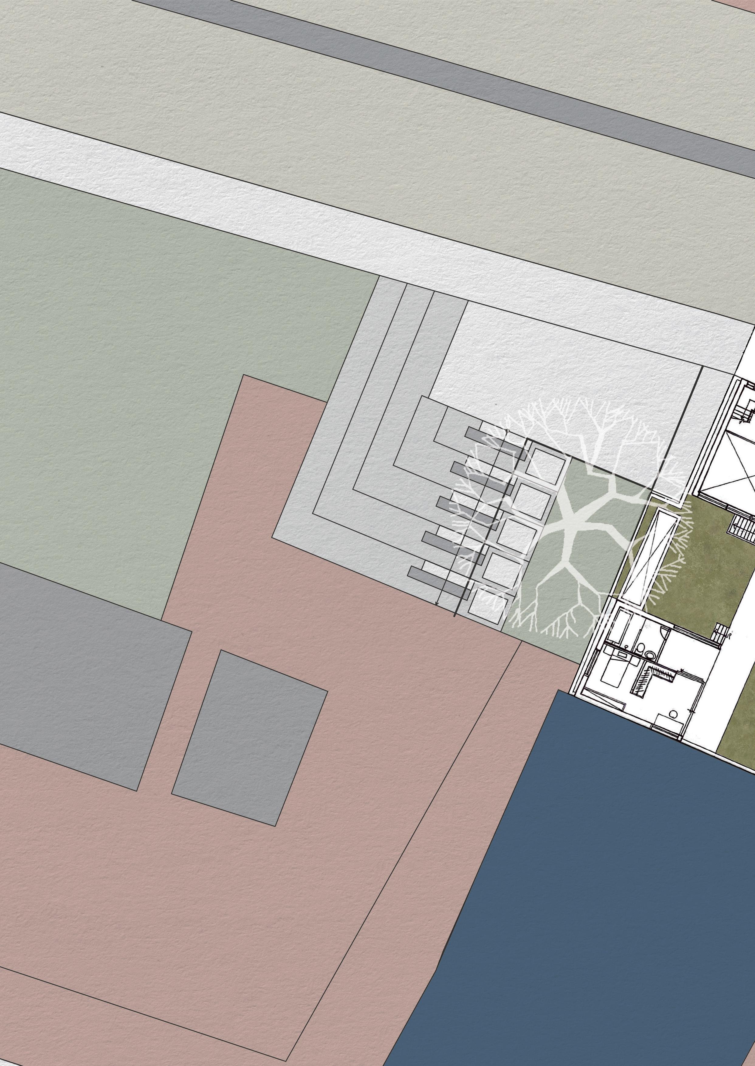 因為周遭人流較多,所以將家庭中較私 人的起居室放地下,並在靠近淡水河的 空間設計成會隨著漲潮淹沒或露出的空 間
