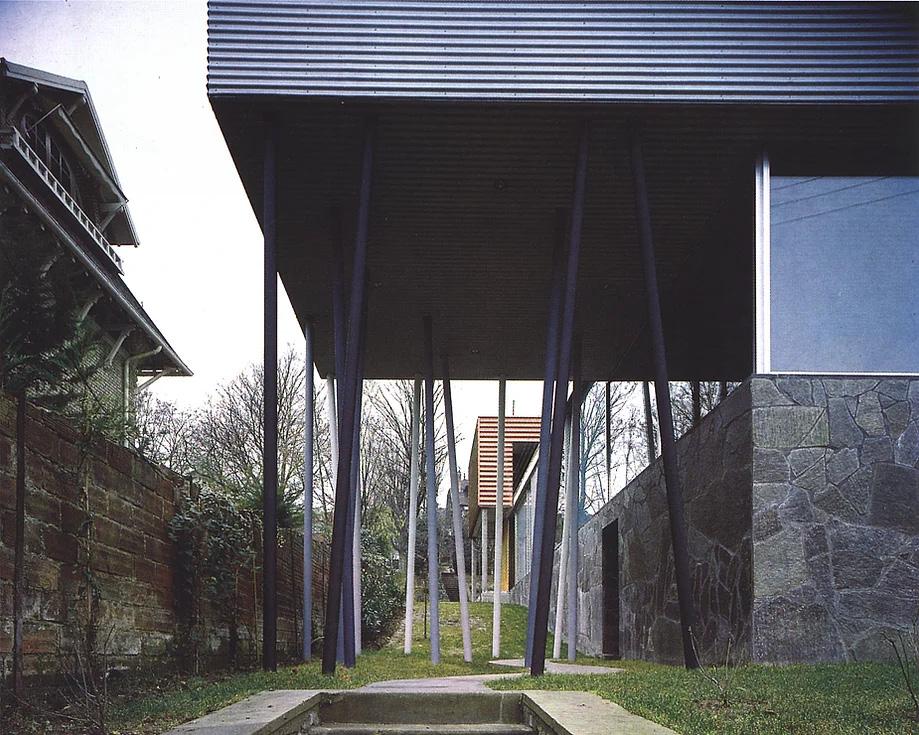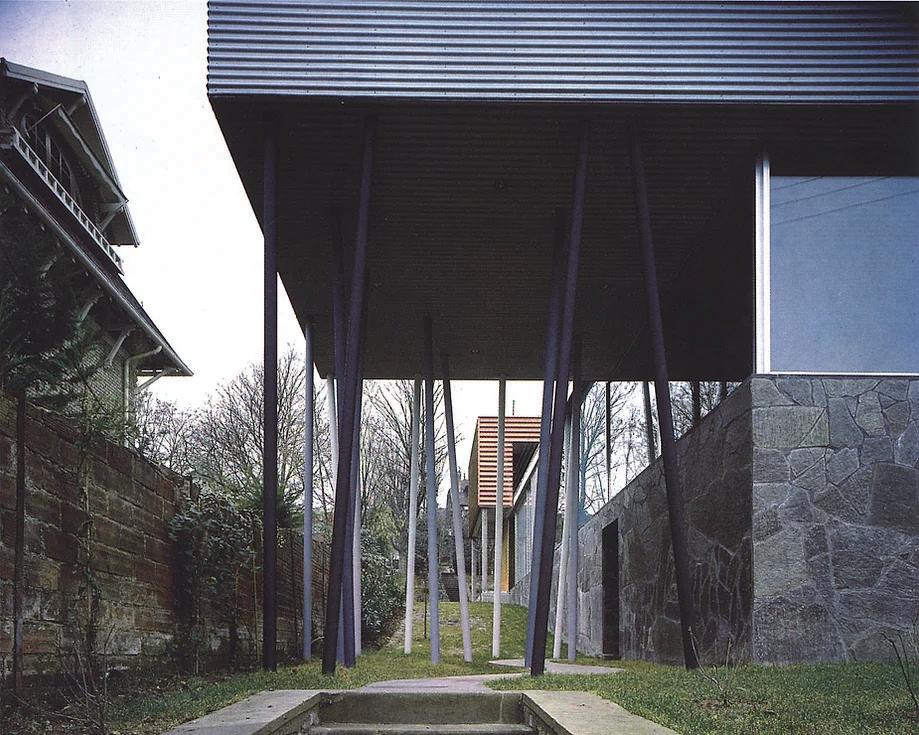 外部樓梯部分採全室外,部分採半室外, 創造出室內外交界模糊的迷走感。