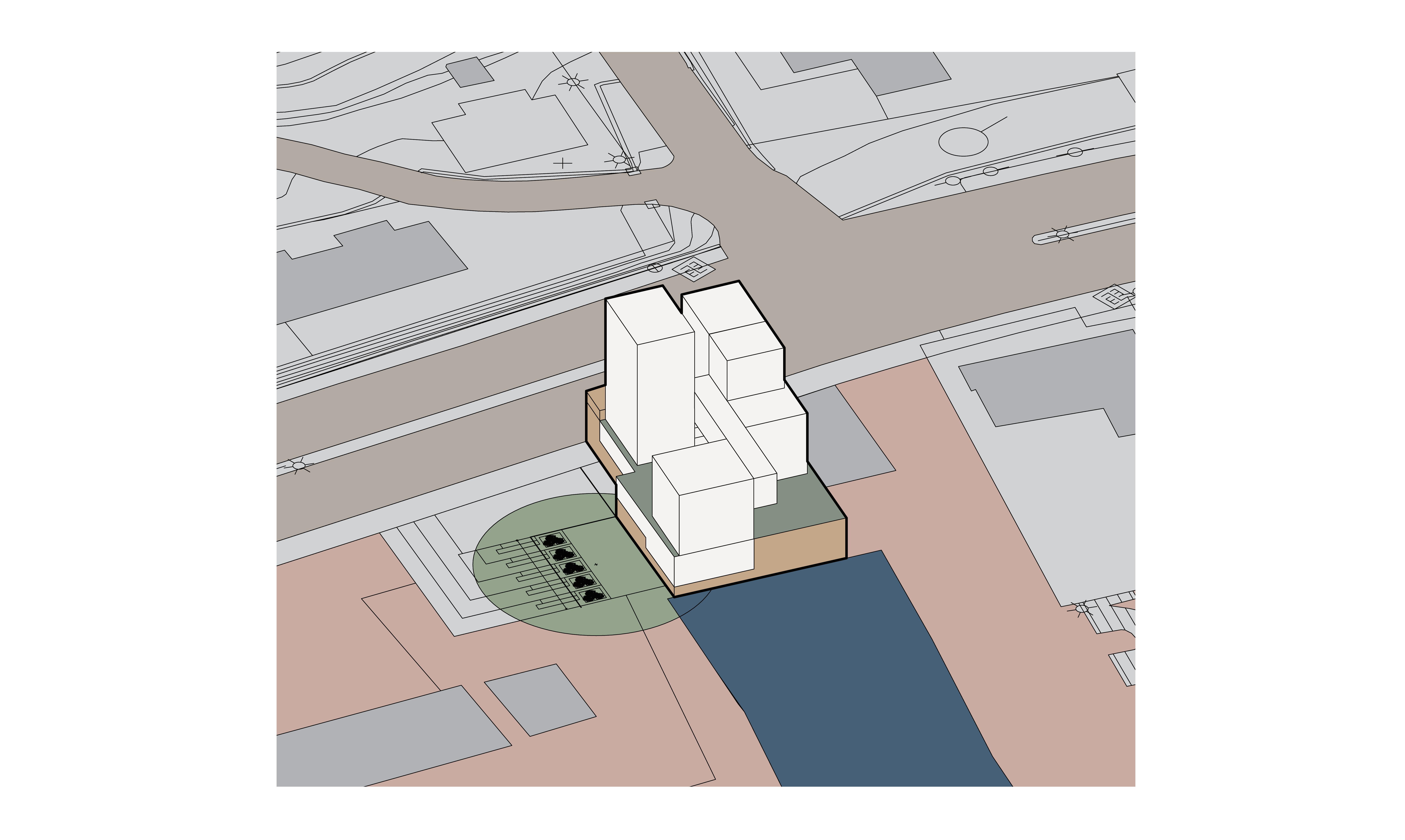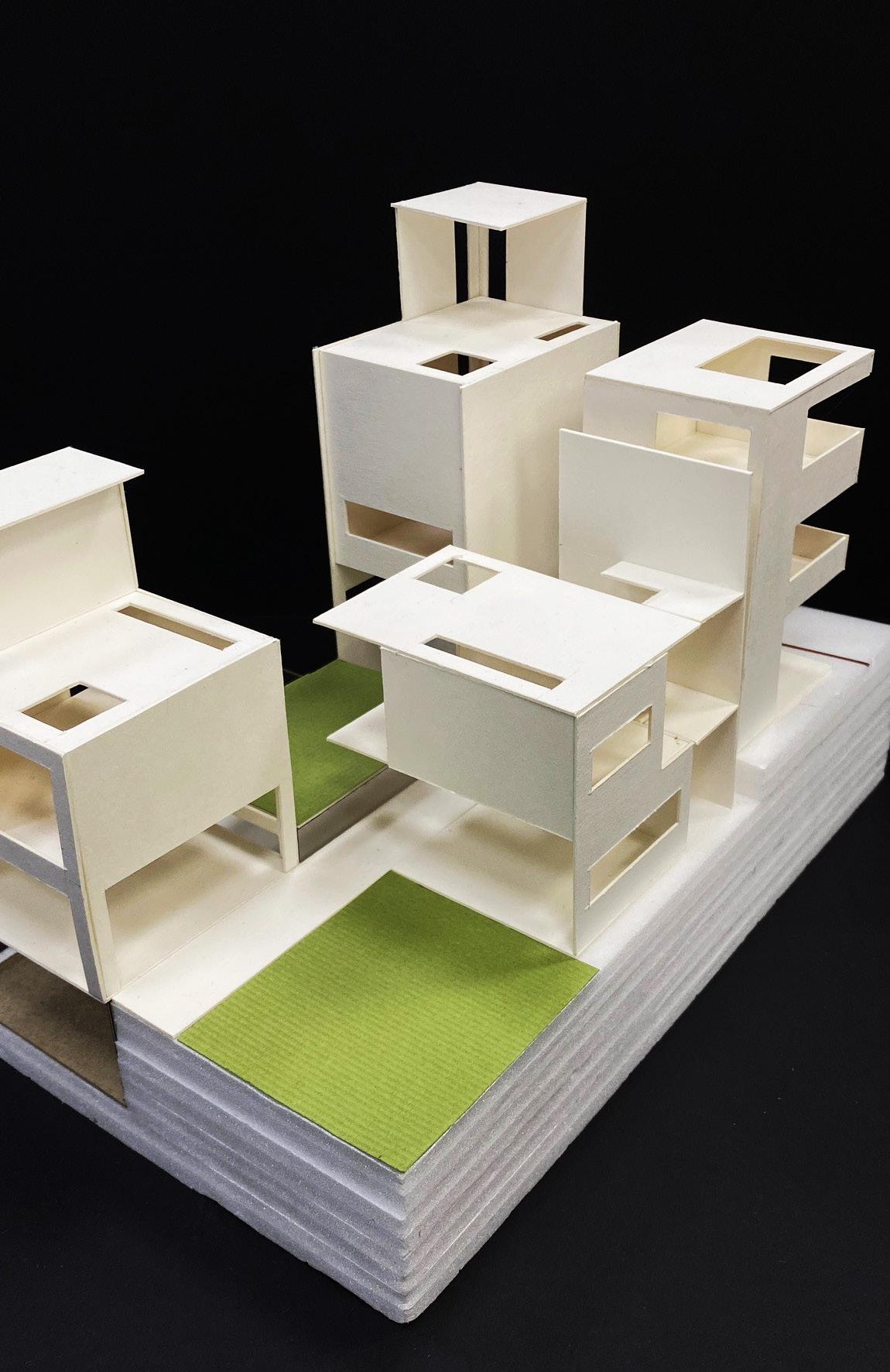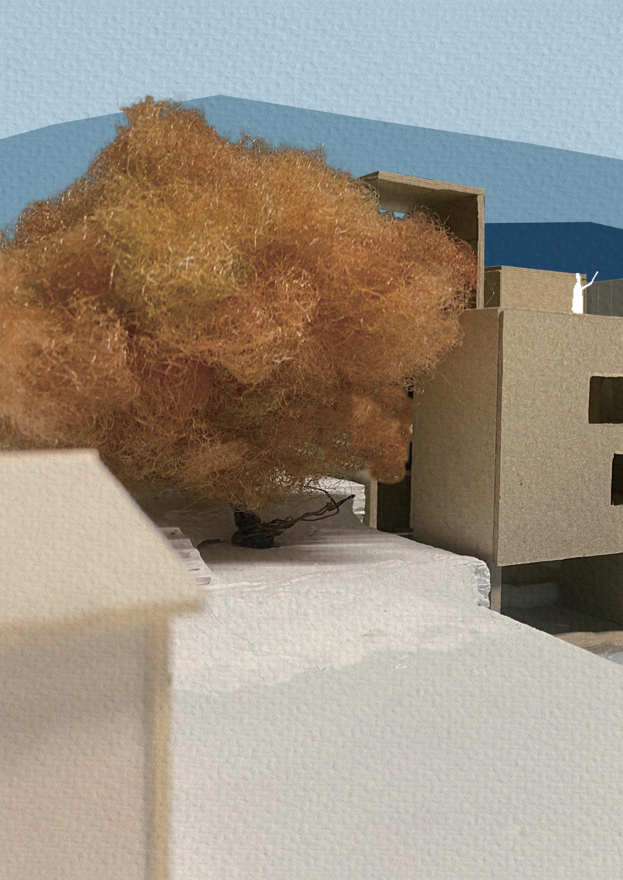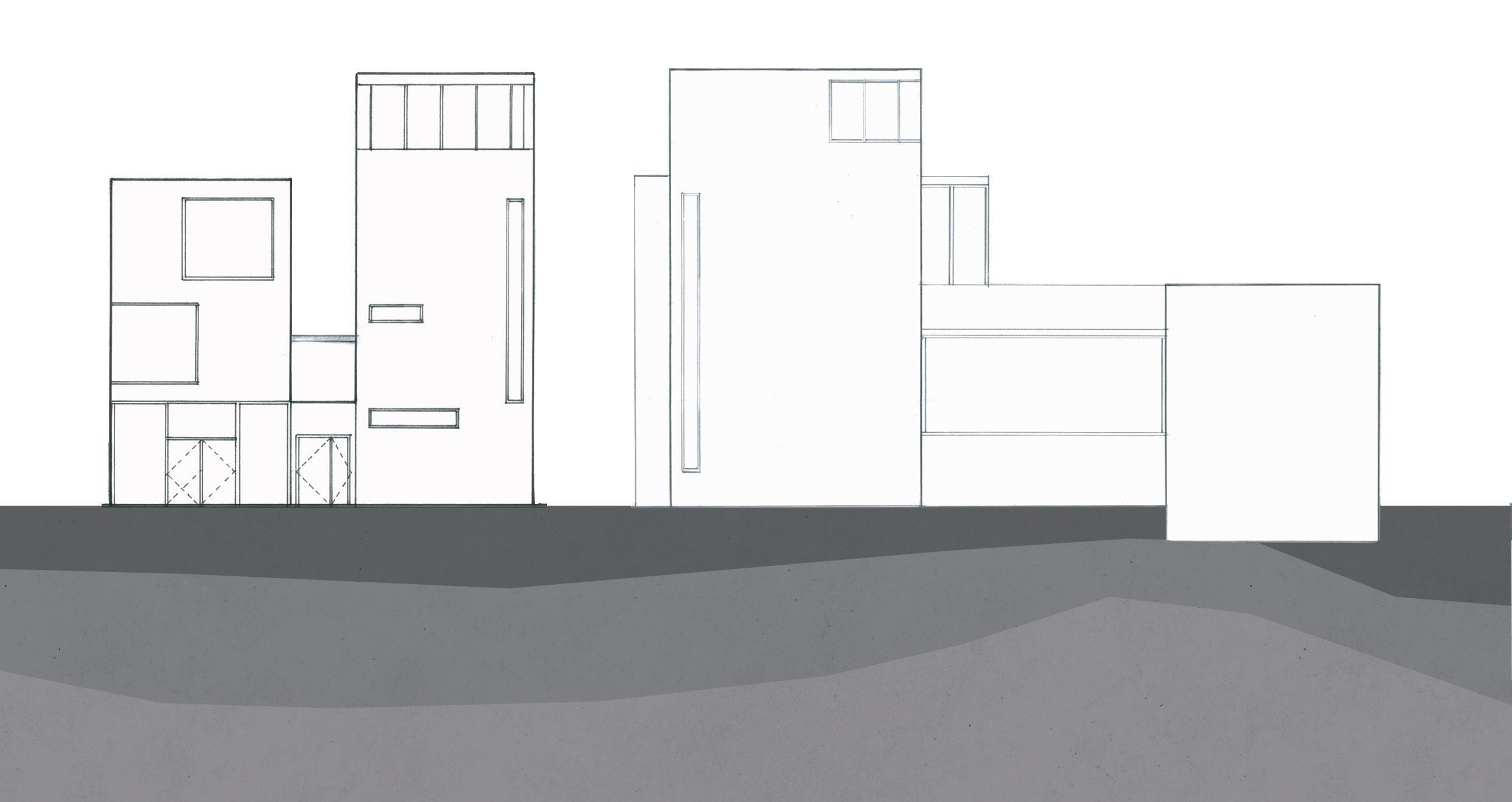 因基地的西側為一棵高12公尺的榕樹, 東側為高3公尺的遺址,所以量體安排 上將最高父母空間放置在靠西側,將較 低的長輩空間放置東側