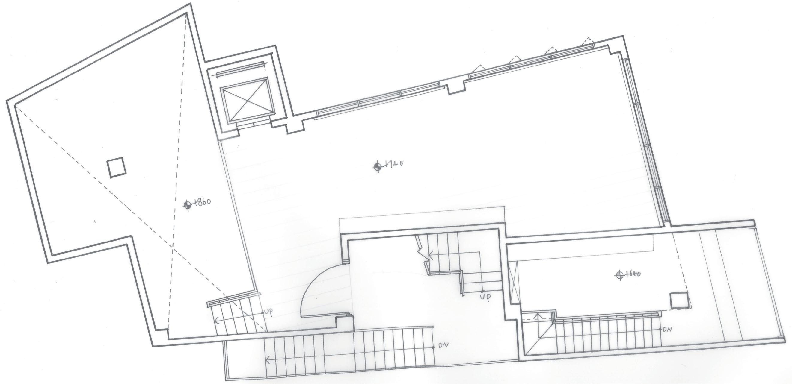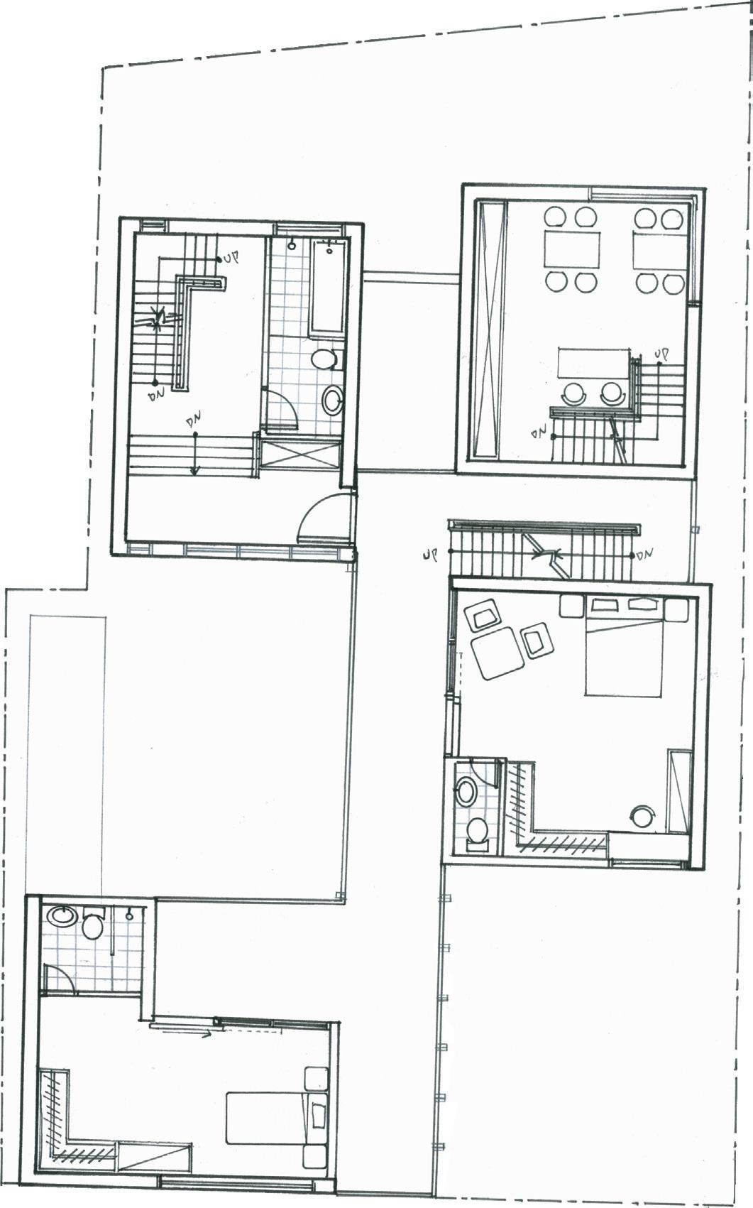 垂直空間落在基地中段,希 望整合動線與此,也創造家 人間會相遇的空間