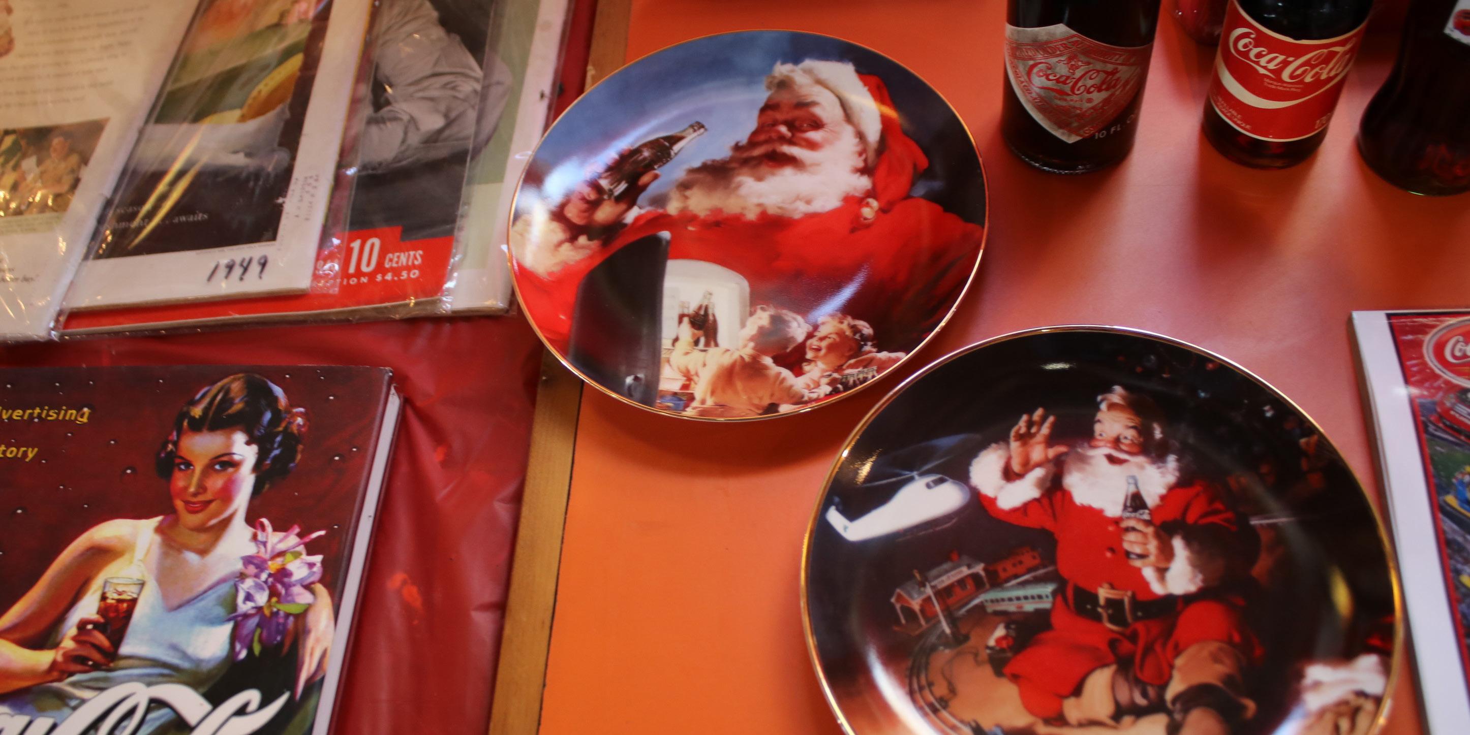 CLOCKWISE FROM LEFT: The Christmas tree upstairs in the museum; Coke trays and antique bottles.
