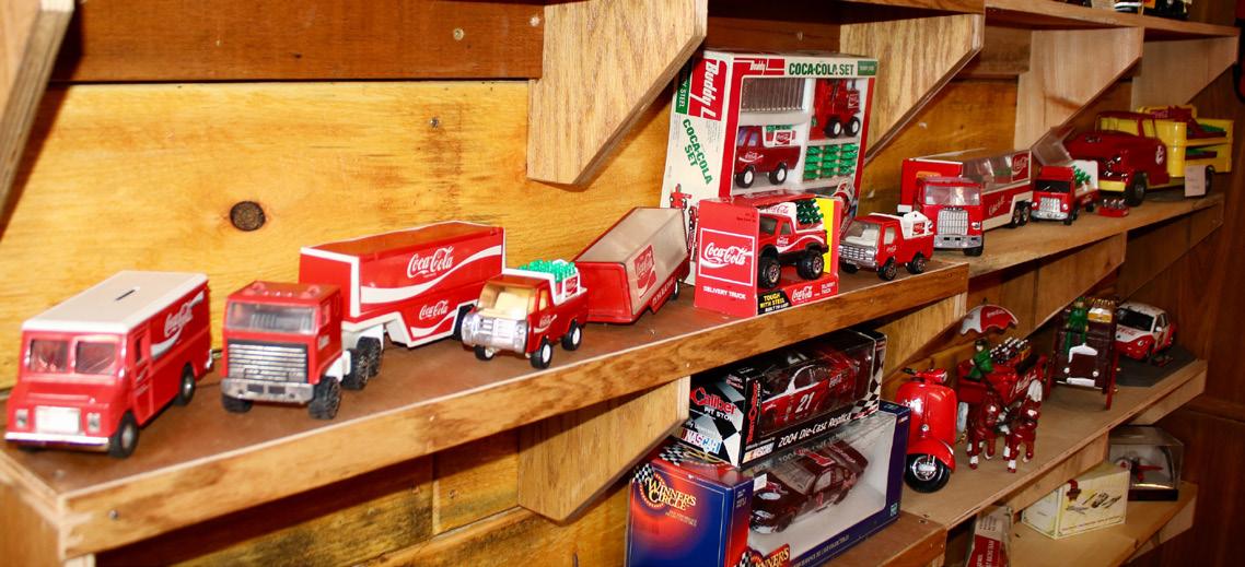 You can spend hours looking through all his Coca-Cola treasures — bottles from different cities all over the world, historic bottles, trays, pins, clothing, cookie jars, car models, throws, signs, a lot of signs, train sets, Christmas decorations and a lot more.