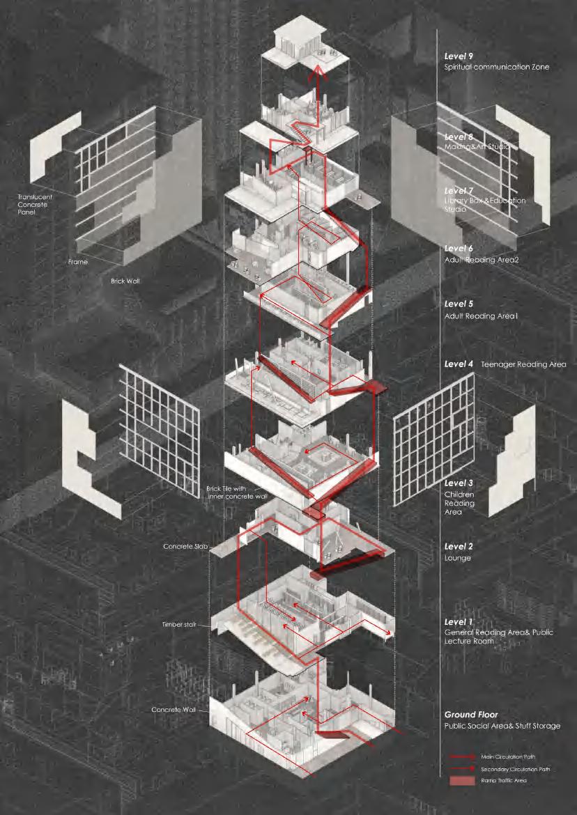 The section shows most two important mountainous trends in the Library. With this different heights, though the area on the top is smaller than the ground, but people still have chances to go outside or see overview on the platform.