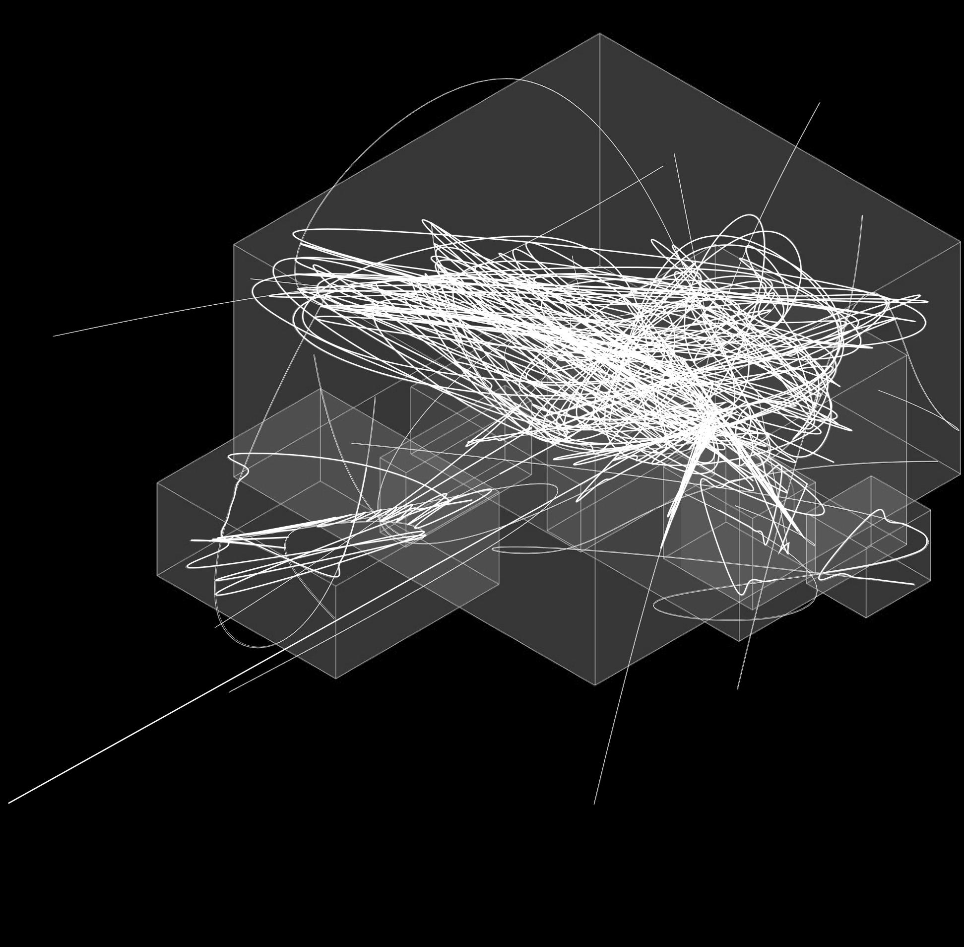プラグインのFoxを用いて、樹 木を避けて増殖する正四面体ユ ニットのスタディを行なった。