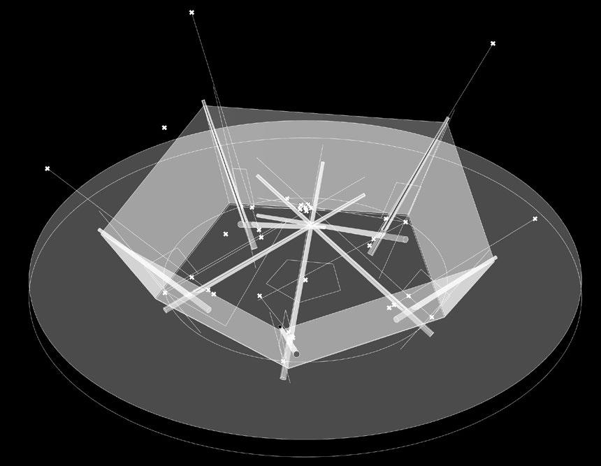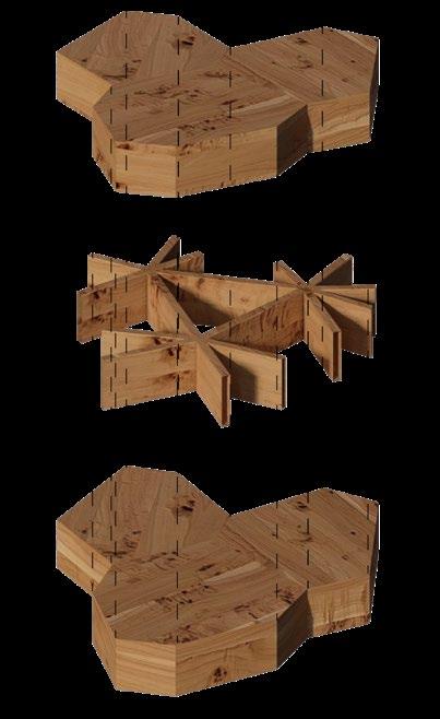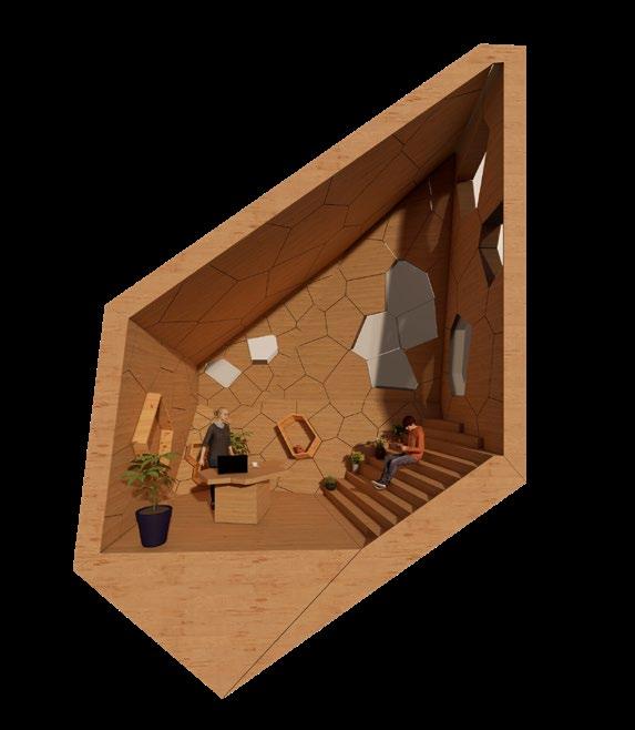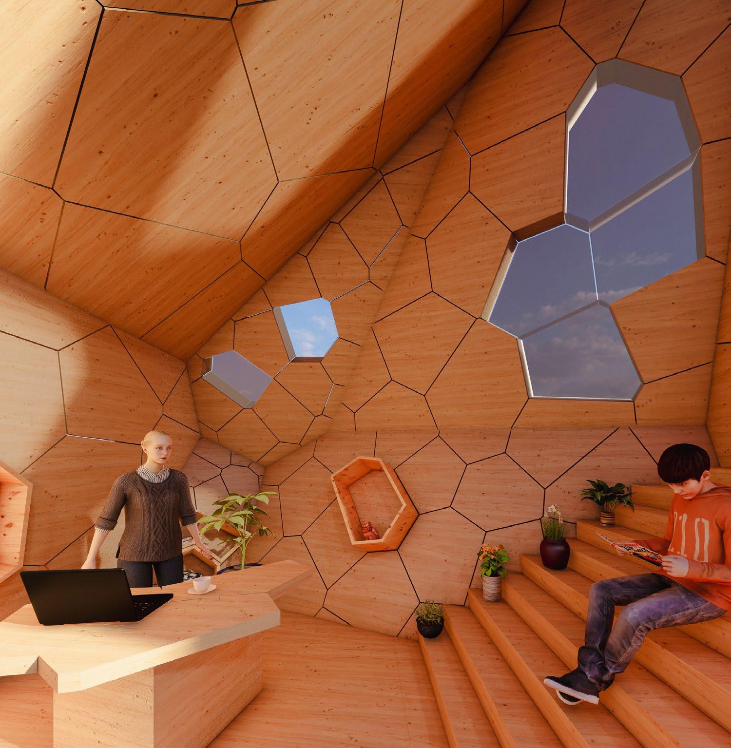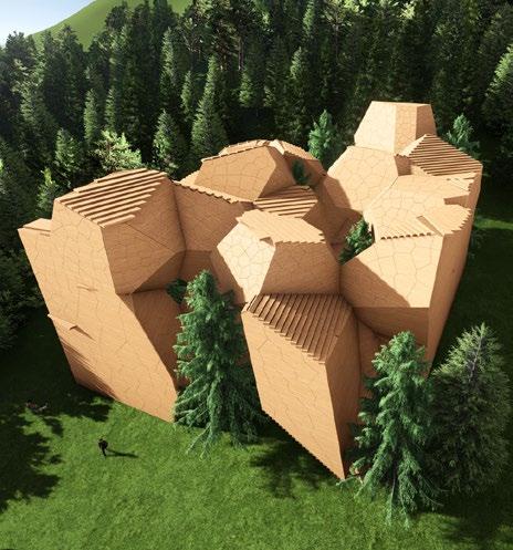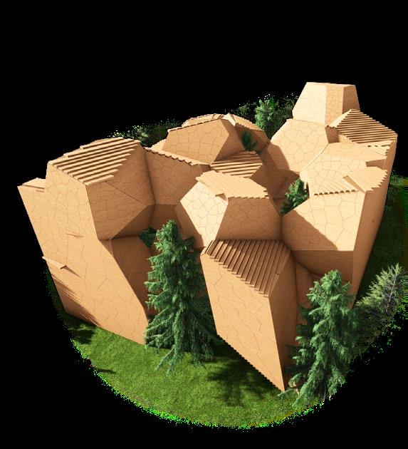 VUILDチームから与えられた「デジタルファブリケー ションによる集合住宅の可能性」をテーマに、1週間で スタディからプレゼンまでを行った。私たちは、樹木を 避けるように建てられた立体ボロノイの面を、可搬の平 面ボロノイパネルで構成し、周辺の樹木の間伐サイクル に合わせて成長し、朽ちていく集合住宅を提案した。