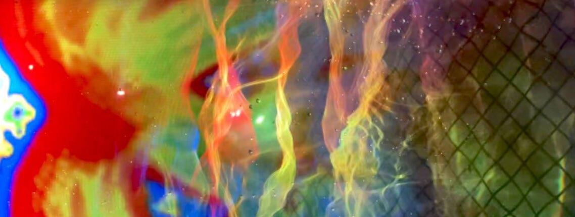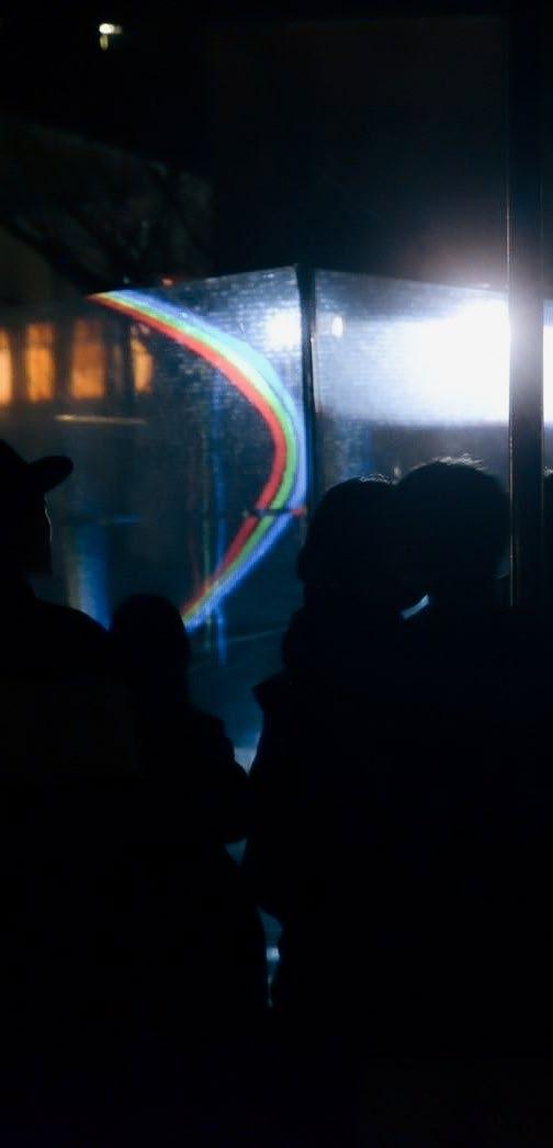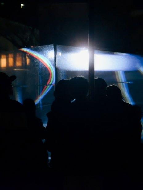 Cyber Rippleは、透明スクリーンとスマートフォンから のインタラクションを用いたプロジェクションマッピン グによるインスタレーションである。水面に浮かぶ映像、 風で水面に揺らぐ映像、WEBインタラクションによる映 像変化などの無数のさざ波が、一つの流れとなり、絶え 間なく変化し続ける多元的な光の空間体験を創り出す。