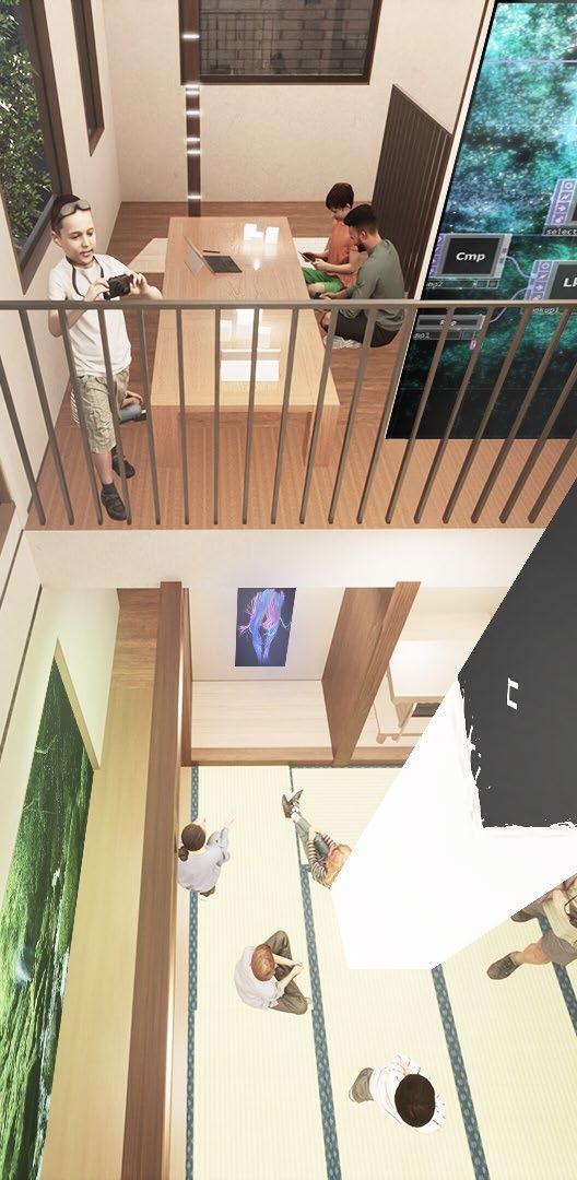 01 モノリスと畳パズルの空間 会話が液体としてモノリス溜ま り、畳配置によってデジタル掛 け軸が変化する。