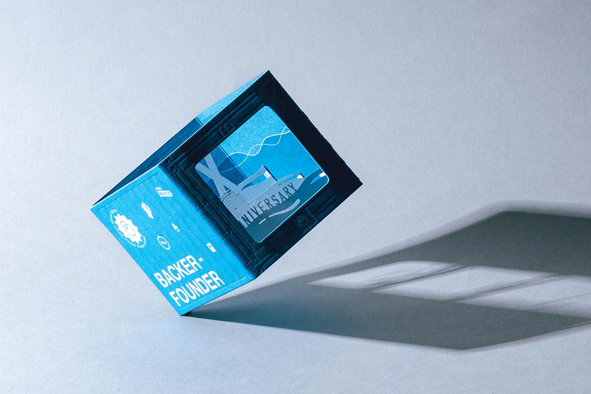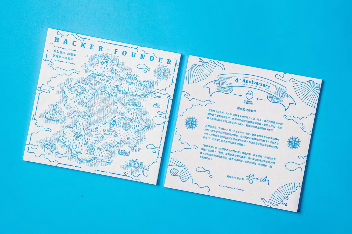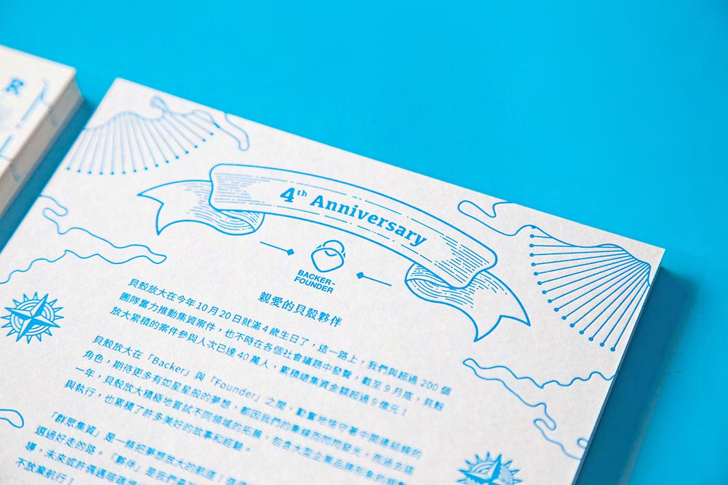 在「群眾集資」這條廣大的航道上,「貝殼放大」自比一艘為 Founder 指引明燈的前鋒船 艦,不放棄任何一件待挖掘的寶藏、任何一處未開發的新大陸,讓擁有夢想的人,安心開 闢屬於自己的事業版圖。今年為貝殼四週年生日,四年來累積了超過 200 件專案執行的經 驗,為了呼應如此驚人的數字與成績,在賀卡設計上期望以合理且富有深意地方式詮釋。