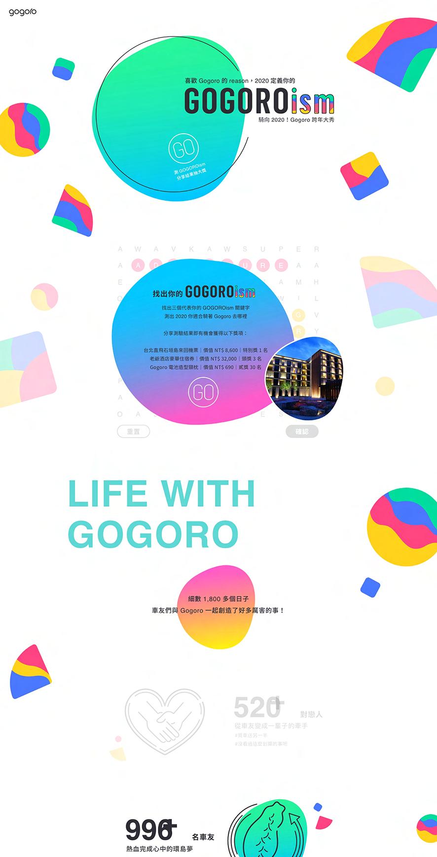 將視覺抽象化,利用不規則的漸層色塊,象徵車主喜愛 Gogoro 的各種理由。而對比主要色塊的漸層流動,輔助圖 形則使用較為明確的曲線分割與幾何圖形,也代表著在眾多車主裡,每個人的理念都堅定不移。