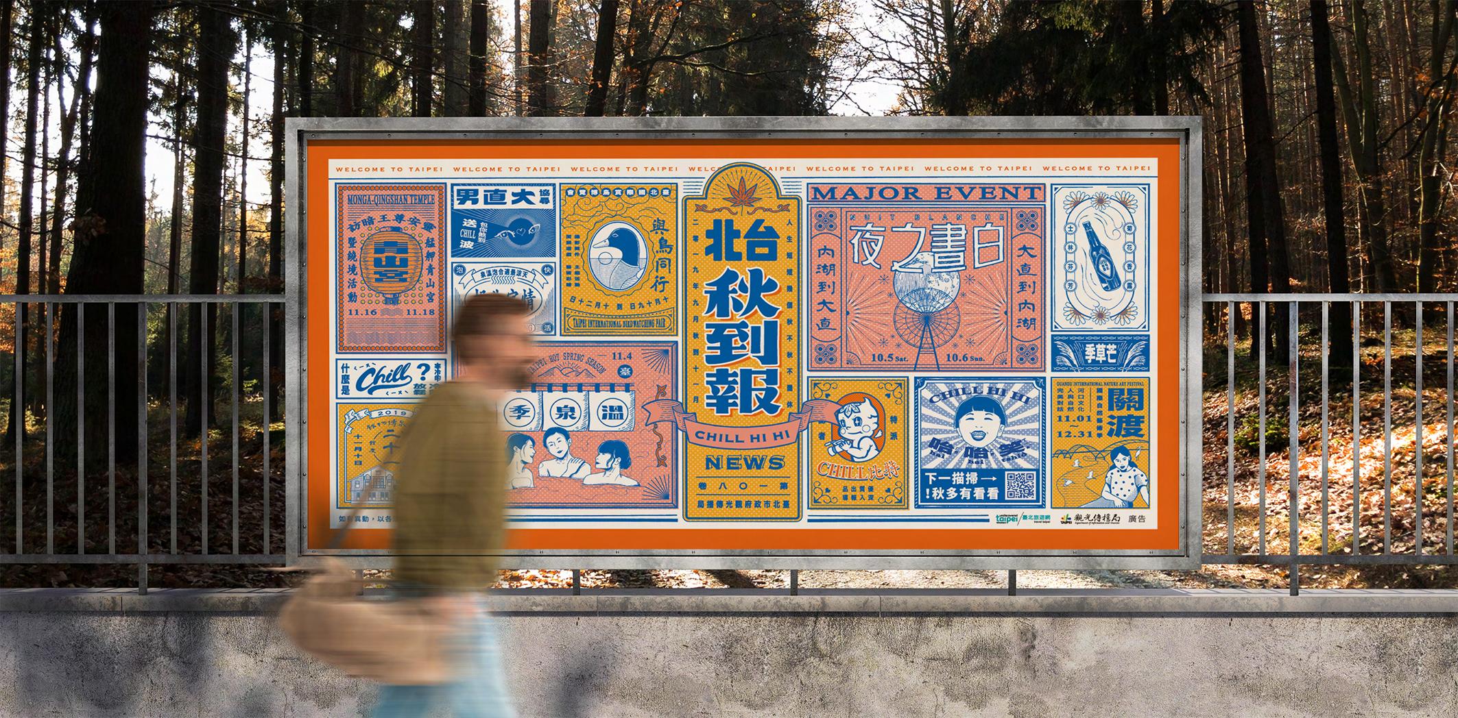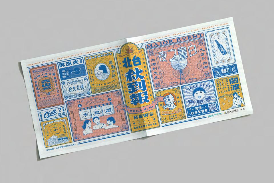 該專案目的為行銷北市觀傳局秋冬季所有活動的總集廣告,因此以「秋」字諧音,以復古報紙的概念 取名為「台北秋到報」,在設計上除了參考古早報紙的手繪插圖、也加入了現代報紙的編排風格,期 望透過兩種年代的報紙性格碰撞出有趣的畫面。