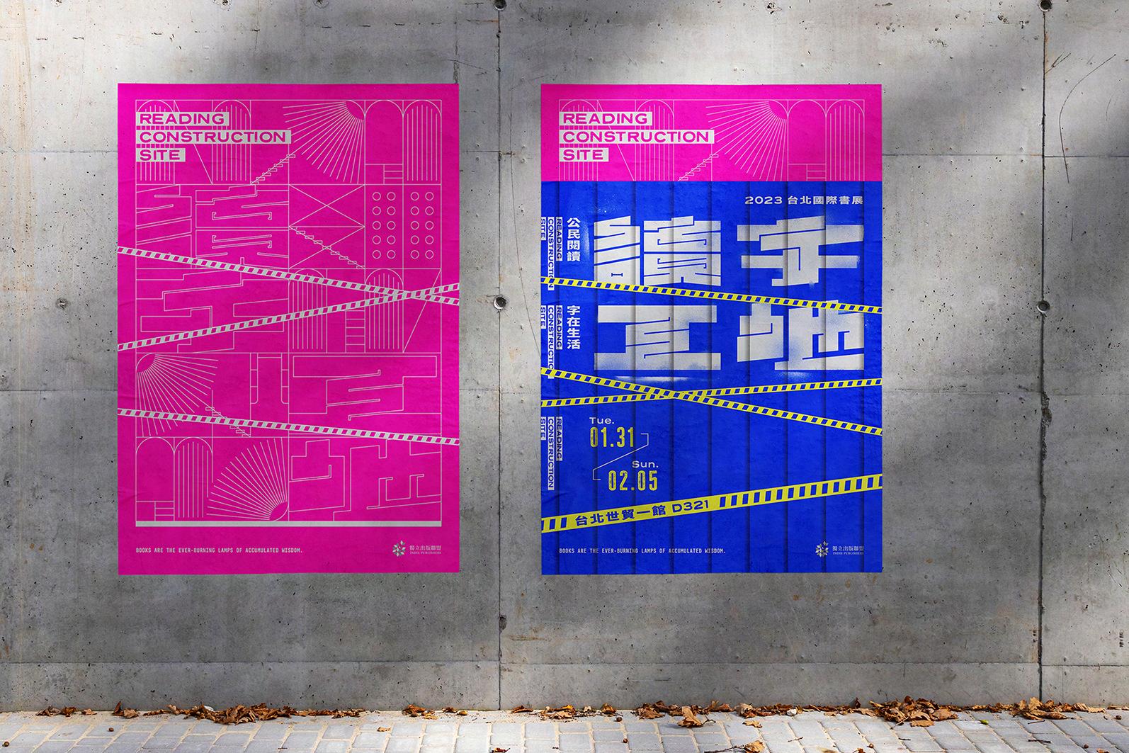 視覺發想源自於施工場地外圍的鐵皮圍牆,圍牆讓工地充滿了未知與神秘感,在一切建造 起來以前,外人無法得知未來這棟建物的模樣。以此概念呼應閱讀的魅力,圍牆是書本封 面、鷹架是文字。在閱讀的過程中,我們也是藉由一字一字的堆砌,完成腦中那棟名為 「思想」的建築。